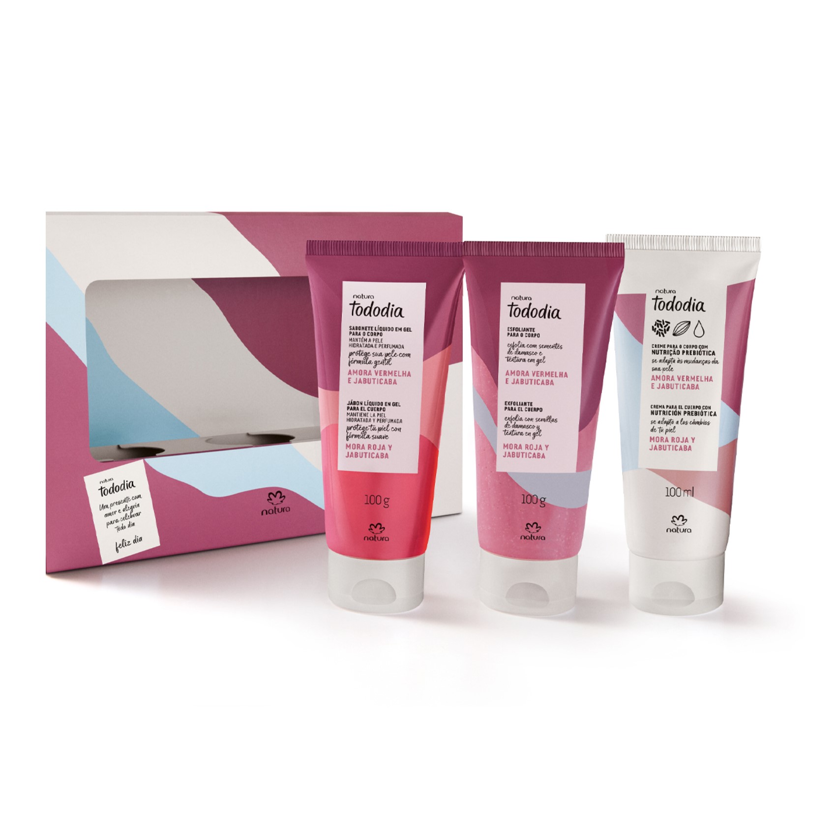 Presente Natura Tododia Cuidados Amora Vermelha E Jabuticaba (3 Itens).<br /> <br /> <br /> Presente com ritual completo na fragrância alegre e exuberante de Tododia Amora Vermelha e Jabuticaba.<br /> <br /> Presente montado em uma linda caixa tipo vitrine que exibe o trio de produtos de Tododia Amora Vermelha e Jabuticaba.<br /> <br /> Pronto para presentear e encantar! Traz o Sabonete Líquido que limpa delicadamente a pele, o Creme Desodorante Nutritivo que deixa a pele mais firme e o Gel Esfoliante que remove impurezas e células mortas. <br /> <br /> Conteúdo:<br /> <br /> 1 Creme desodorante nutritivo para o corpo 100 ml;<br /> <br /> 1 Sabonete líquido para o corpo 100 ml;<br /> <br /> 1 Sabonete líquido em gel esfoliante para o corpo 100 ml;<br /> <br /> 1 Caixa especial de presente.<br /> <br /> Benefícios:<br /> <br /> Creme Desodorante nutritivo: pele perfumada, firme e ultramacia com o poder da nutrição prebiótica, que age na microbiota e fortalece os microrganismos de defesa da pele.<br /> <br /> Com prebiótico, manteiga de cacau e óleo de linhaça, combinação de ingredientes de origem natural que hidrata até as camadas mais profundas.<br /> <br /> • Sabonete líquido: fórmula que limpa delicadamente, mantendo a hidratação natural da pele.<br /> <br /> Sua textura em gel forma uma espuma abundante e cremosa, com uma fragrância frutal leve e envolvente para deixar o banho ainda mais revigorante.<br /> <br /> • Sabonete esfoliante: fórmula com textura em gel e partículas de origem natural que proporcionam uma esfoliação suave.<br /> <br /> Com limpeza purificante, auxilia na renovação celular da pele, mantendo a hidratação natural e deixando-a perfumada.