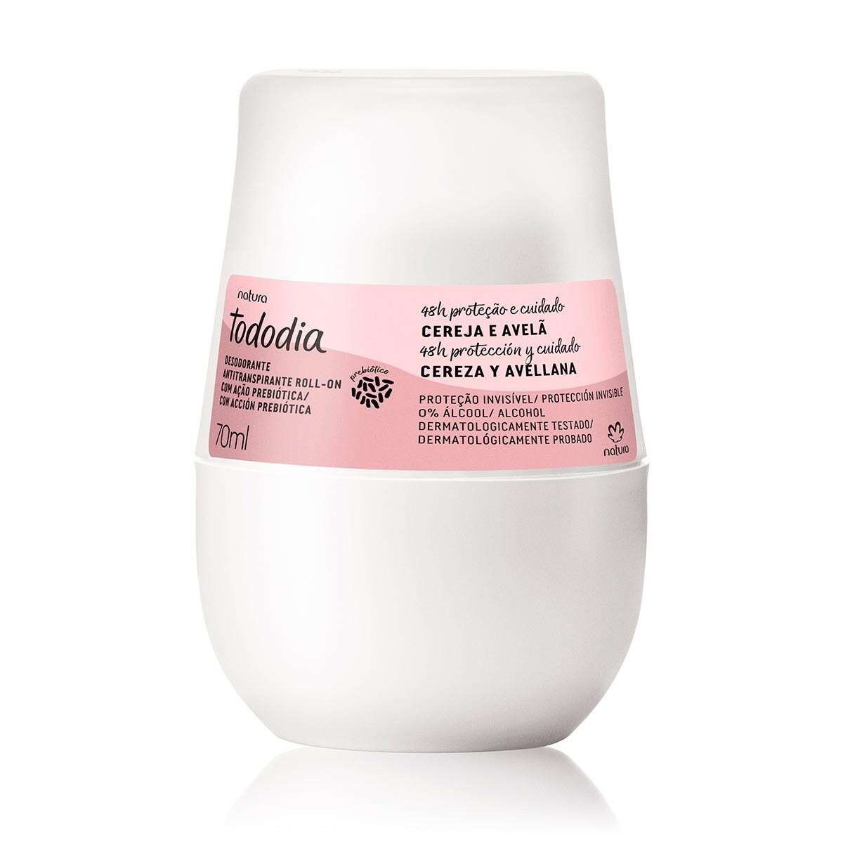 Natura Desodorante Antitranspirante Tododia Roll On Cereja e Avelã 70 mL.<br /> <br /> Fórmula com ação prebiótica que protege e perfuma por até 48h sem manchar suas roupas.<br /> <br /> Viva seu corpo livre e protegido.<br /> <br /> Complete seu cuidado diário com o desodorante roll-on Tododia, com ação prebiótica que ajuda no controle do mau odor e oferece proteção por até 48h contra os efeitos do suor.<br /> <br /> Sua fórmula exclusiva cuida da pele, mantém a hidratação natural e possui secagem rápida que não deixa a pele úmida e nem pegajosa.<br /> <br /> Evita manchas em roupas claras e escuras.<br /> <br /> Benefícios:<br /> <br /> • Ação prebiótica que controla as bactérias responsáveis pelo mau odor.<br /> • 48h de proteção desodorante e antitranspirante.<br /> • Cuida e mantém a hidratação com vitamina E.<br /> • Proteção invisível que não mancha as roupas claras e escuras.<br /> • Dermatologicamente testado.<br /> • Fragrância suave e confortável com notas florais.<br /> • Produto vegano.<br /> • Fórmula 85% de origem natural.<br /> • Frasco 70% PE verde.<br /> • Sem testes em animais.