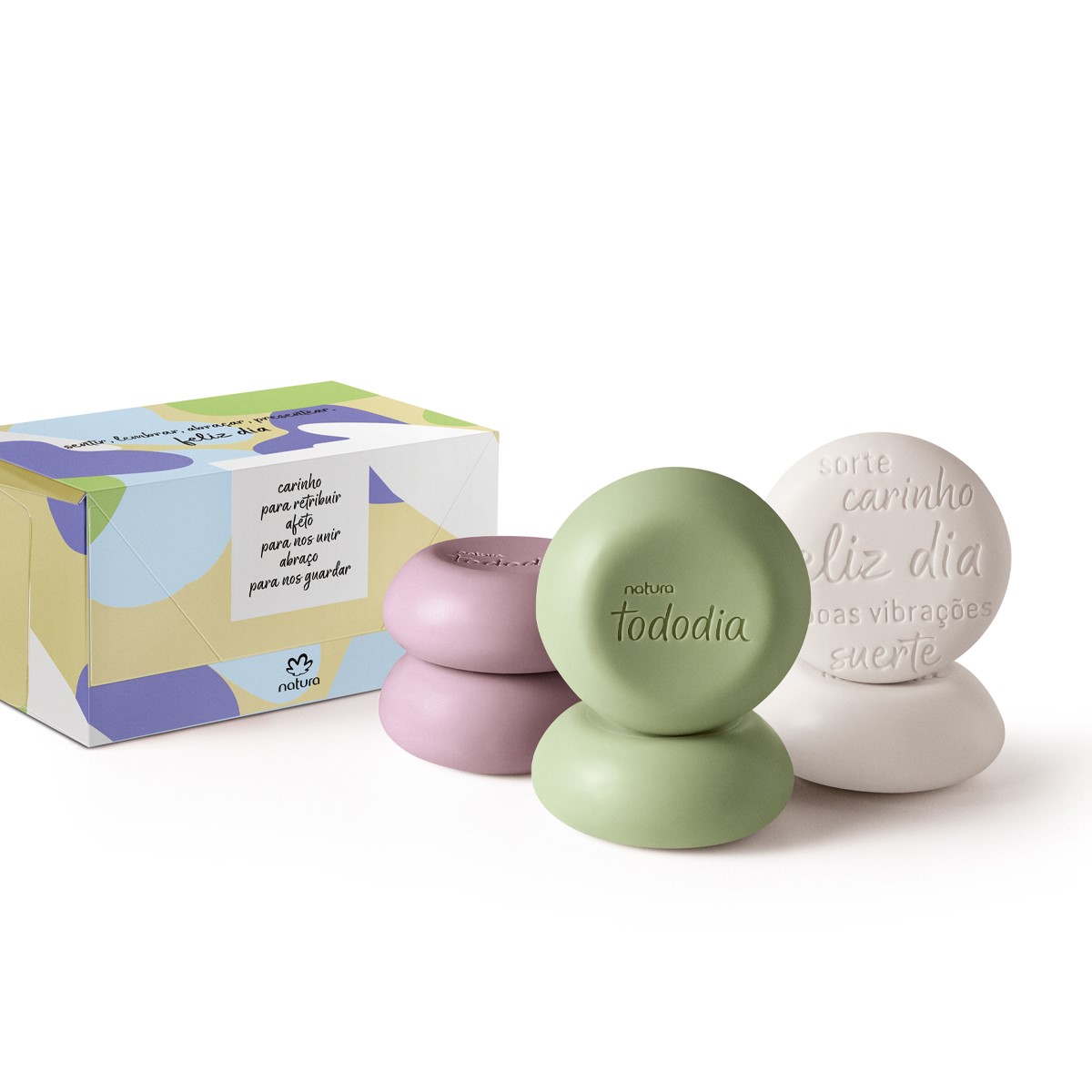 O Presente Natura Tododia Sabonetes Sortidos é um convite para pausar o tempo e se reconectar a si mesmo através de um banho revigorante.<br /> <br /> Composto por 6 unidades dos queridinhos sabonetes em barra puro vegetal, este presente promove uma sensação agradável, enquanto limpa e deixa a pele macia e nutrida.<br /> <br /> Sua fórmula suave e com ingredientes naturais evita o ressecamento e prepara a pele para receber a combinação nutritiva e inteligente dos hidratantes Natura Tododia.<br /> <br /> Os sabonetes possuem decoração escrita na própria barra do sabonete de "feliz dia", "carinho", "boas vibrações" e "sorte".<br /> <br /> Todos são acomodados na caixa presenteável decorada que possui alça e uma mensagem especial de "feliz dia". <br /> <br /> Conteúdo:<br /> <br /> Caixa com 6 unidades de sabonete em barra puro vegetal.<br /> <br /> (2 algodão, 2 alecrim e sálvia, 2 amora vermelha e jabuticaba) de 90 g cada.<br /> <br /> É bom você saber:<br /> <br /> Frase de afeto na embalagem;<br /> <br /> Produtos veganos;<br /> <br /> Caixa presenteável;<br /> <br /> Perfeito para presentear.
