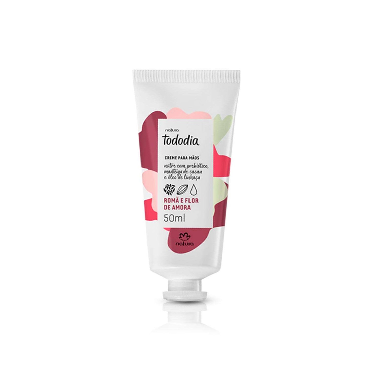 Mãos mais macias e perfumadas com a fragrância marcante de Tododia Romã e Flor de Amora.<br /> <br /> Nutrição profunda para as mãos, com a poderosa ação prebiótica que mantém o equilíbrio natural da flora da pele.<br /> <br /> Textura cremosa que deixa as mãos macias, seca rapidinho e perfuma com a fragrância marcante de Tododia Romã e Flor de Amora. <br /> <br /> Benefícios:<br /> <br /> •Pele mais firme e ultramacia.<br /> <br /> •Nutrição prebiótica: age na microbiota fortalecendo os microrganismos de defesa da pele.<br /> <br /> •Textura cremosa, fácil de espalhar e absorve rapidinho.<br /> <br /> •Com prebiótico, manteiga de cacau e óleo de linhaça, combinação de ingredientes de origem natural que hidrata até as camadas mais profundas.<br /> <br /> •Fragrância marcante e envolvente com notas adocicadas e frutais.<br /> <br /> •Produto vegano com fórmula 95% de origem natural. <br /> <br /> Conteúdo: 1 creme nutritivo para as mãos, 50 ml.