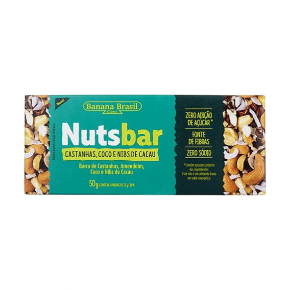 Informações técnicas do produto:<br> A Nutsbar Castanhas, Coco e Nibs de Cacau, da Banana Brasil, é uma barrinha de cereais com uma composição rica em alimentos nutritivos, prático para levar com você para qualquer lugar e consumir a qualquer hora do dia. Além disso é boa fonte de fibras, não contém glúten e é adoçado com stevia.<br> <br> Recomendação de uso:<br> Pode ser consumida a qualquer hora do dia, é só abrir e curtir!<br> <br> Por que escolher esse produto?<br> Sem glúten<br> Zero adição de açúcar<br> Adoçado com stevia<br> Zero sódio<br> Fonte de fibras<br> 4,1g de proteína por barra<br> Sobre a marca:<br> A Banana Brasil, no mercado desde 1985, foi pioneira no segmento de barras de frutas e hoje conta com um vasto portfólio de produtos com ingredientes selecionados. Está sempre atenta ás tendências mundiais de comportamento e saudabilidade, garantindo sempre que os melhores produtos cheguem aos consumidores, unindo saúde e praticidade.
