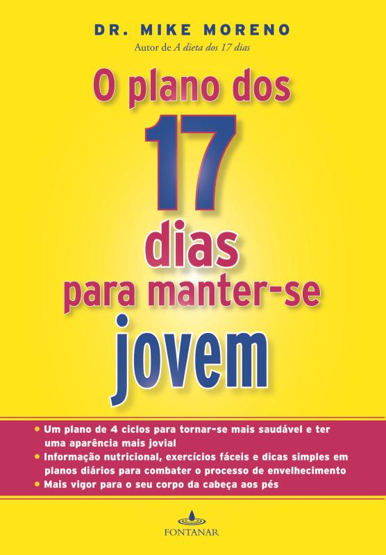 A todo instante o corpo humano está em pleno processo de envelhecimento. As mudanças no organismo são sentidas com a perda progressiva de energia para atividades cotidianas, a diminuição da flexibilidade das articulações e com o aparecimento de características como pele flácida, rugas, cabelo grisalho ou ralo. Enfim, um declínio geral da saúde do corpo e da mente. No entanto, o que novas pesquisas vêm reforçando é que o fato de envelhecer e o processo físico do envelhecimento não precisam estar tão intimamente ligados. Formado em medicina pela Universidade da Califórnia, Dr. Mike Moreno, autor de A dieta dos 17 dias, desenvolveu um programa profilático constituído por quatro ciclos, que deve ser posto em prática com a dedicação de 17 dias para cada etapa. As ações propostas atuam nos cinco sistemas vitais para o bom funcionamento do organismo. Moreno direciona o método para combater os cinco principais fatores do envelhecimento, sendo eles: a inflamação, o estresse oxidativo, a glicosilação (processo que causa doenças típicas do envelhecimento, como diabetes e mal de Alzheimer), a metilação (responsável por manter o bom funcionamento do DNA) e a baixa imunidade. Os estudos observados pelo médico, assim como o guia prático elaborado por ele, estão reunidos no livro O plano dos 17 dias para manter-se jovem.