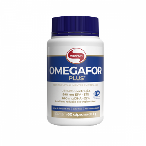 Ômega For Plus Vitafor 60 CápsulasÉ um suplemente alimentar à base de óleo de peixe (fonte de Ômega-3)• Possui alta concentração de seus derivados, 990 mg de EPA (33% na porção) e 660 mg de DHA (22% na porção).• Fonte de ômega-3 (TG), que auxilia na redução dos triglicerídeos e possui a certificação internacional IFOS™, garantindo a isenção de contaminantes e metais pesados, além da tecnologia Odor Free.INGREDIENTES:Óleo de peixe (ômega 3). Composição da cápsula: gelatina, água purificada e umectante glicerina. ALÉRGICOS: CONTÉM PEIXE. NÃO CONTÉM GLÚTEN.Compre agora o Ômega For Plus Vitafor 60 Cápsulase garanta uma entrega rápida e segura!