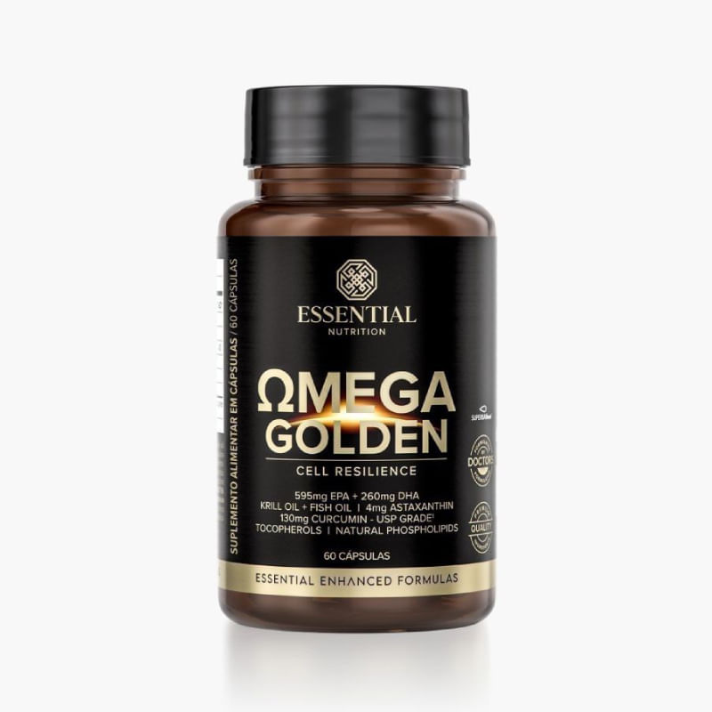 <p dir="ltr">O <strong>Ômega Golden</strong> é um suplemento da Essential Nutrition que combina óleo de peixe em triglicerídeos (TG) e óleo de krill em fosfolipídeos, com compostos antioxidantes como curcumina (USP Grade), astaxantina e vitamina E. Cada porção fornece 595 mg de EPA e 260 mg de DHA, além de ingredientes que atuam de forma sinérgica, potencializando a estabilidade e eficiência da fórmula.</p> <h2 dir="ltr">Sugestão de consumo:</h2> <p dir="ltr">Ingerir 2 cápsulas ao dia, ou conforme recomendação de profissional da saúde.</p> <h2 dir="ltr">Motivos para escolher o produto:</h2> <ul> <li dir="ltr" aria-level="1"> <p dir="ltr" role="presentation">Contém 595 de EPA e 260mg de DHA na porção; </p> </li> <li dir="ltr" aria-level="1"> <p dir="ltr" role="presentation">Matéria prima com alto grau de pureza; </p> </li> <li dir="ltr" aria-level="1"> <p dir="ltr" role="presentation">130mg de curcumina na porção; </p> </li> <li dir="ltr" aria-level="1"> <p dir="ltr" role="presentation">4mg de astaxantina na porção; </p> </li> <li dir="ltr" aria-level="1"> <p dir="ltr" role="presentation">Certificação internacional de excelência – IFOS; </p> </li> <li dir="ltr" aria-level="1"> <p dir="ltr" role="presentation">Isento de contaminação por metais pesados; </p> </li> <li dir="ltr" aria-level="1"> <p dir="ltr" role="presentation">Não contém glúten, sem lactose e sem açúcar. </p> </li> </ul> <h2 dir="ltr">A Marca</h2> <p dir="ltr">A <strong>Essential Nutrition</strong> é uma marca especializada em nutrição funcional, produzindo produtos de extrema qualidade, utilizando as melhores matérias-primas e em suas concentrações ideias, excluindo o uso de ingredientes geneticamente modificados, glúten, lactose, corantes, conservantes e adoçantes artificiais.</p>