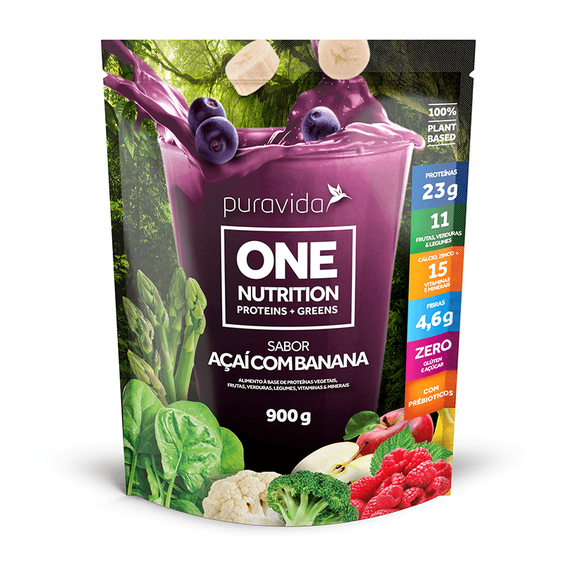 <br>One Nutrition açaí com banana, da Pura Vida, é feito com ingredientes de alta qualidade, possui 23 g de proteínas na porção. É um concentrado de frutas, legumes e verduras, fornecendo nutrição ao corpo de forma prática e saborosa.<br><br>Uma ótima opção vegana, que fornece poucas calorias e sacia por muito mais tempo, além disso. É livre de glúten e açúcar, ainda conta com a ação de prebióticos.<br><br>Sobre os ingredientes:<br>Proteína de ervilha e arroz: possuem elevado valor biológico, com aminoácidos essenciais.<br>Açaí: possui alto valor energético por conta de gorduras essenciais em sua composição, como os ácidos graxos ômega 6 e ômega 9, além das antocianinas (pigmento roxo do grupo dos flavonoides).<br>Inulina: É uma fibra solúvel, considerada um prebiótico.<br>Banana: Possui diversas vitaminas e minerais. É fonte de potássio.<br>Recomendação de consumo:<br><br>Pode ser liquidificado com água, leite ou com banana congelada.<br><br>Dica: Para uma textura mais cremosa, experimente bater com 300ml de bebida vegetal. A banana congelada pode ser adicionada também.<br><br>Por que escolher esse produto?<br>100% vegetal<br>23 g de proteínas<br>4,6 g de fibras<br>Low carb<br>Sem conservantes<br>Zero açúcar<br>Zero gorduras trans<br>Sobre a marca:<br><br>A Pura Vida é uma empresa que possui o propósito de oferecer saúde, beleza e transformação através de alimentos orgânicos, nutrientes concentrados e produtos que trazem bem-estar e felicidade para as pessoas. Nutrir-se de alimentos puros, livres de pesticidas, conservantes, corantes e outros sintéticos, é fundamental.
