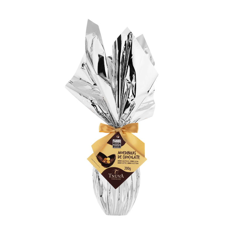 <p>O <strong>Ovo de Páscoa Chocolate com Moedinhas Tnuva, </strong>contém duas bandas de ovo, elaborado com ingredientes cuidadosamente selecionados que quando acrescidos junto ao cacau resultam em um produto delicioso. Feitos com o mais puro cacau (liquor de cacau). Perfeito para consumo em qualquer momento, atendendo às necessidades de um amplo público. </p> <h2><strong>Sugestão de consumo:</strong></h2> <p>Consuma uma porção. Ideal para ser consumido como sobremesa e em lanches intermediários com moderação e para compartilhar com familiares. </p> <h2><strong>Motivos para escolher o produto:</strong></h2> <ul> <li> <p>Ovo de Páscoa vegano; </p> </li> <li> <p>Livre de glúten, soja, leite e proteínas do leite; </p> </li> <li> <p>Zero ingredientes de origem animal; </p> </li> <li> <p>Kosher; </p> </li> <li> <p>Isento de corantes e conservantes artificiais; </p> </li> <li> <p>Sem gorduras trans. </p> </li> </ul> <h2><strong>A Marca</strong></h2> <p>Fundada em 1989, a <strong>Tnuva</strong> é pioneira no Brasil na produção exclusiva de chocolates sem leite ou qualquer ingrediente de origem animal, oferecendo uma experiência deliciosa, segura e acessível para pessoas com alergia, intolerância ou restrição ao leite, além do público vegano. Nossa dedicação à qualidade começa na seleção e processamento da própria matéria-prima, garantindo um chocolate puro, equilibrado e saboroso. Certificados pela rigorosa supervisão Kosher da BKA, asseguramos um padrão internacional de excelência. Com distribuição nacional, atendemos desde consumidores finais até o setor industrial, sempre comprometidos em proporcionar prazer e segurança em cada pedaço de chocolate.</p> <p> </p>