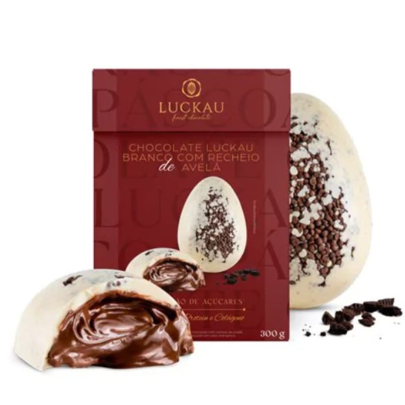 <h2 style="text-align: justify;"><strong>Ovo Chocolate Belga Branco Recheado de Creme de Avela Luckau 300g</strong></h2> <p style="text-align: justify;">O <strong>Ovo de Páscoa sabor chocolate belga branco recheado com creme de avelã Luckau, </strong>contém duas bandas de ovo, elaborado com chocolate branco belga e recheados com um delicioso creme de avelã, adicionado de Whey Protein e Colágeno, trazendo um sabor delicioso.</p> <h2 style="text-align: justify;"><strong>Sugestão de consumo:</strong></h2> <p style="text-align: justify;">Consuma uma porção. Ideal para ser consumido em sobremesas e lanches intermediários com moderação e para compartilhar com familiares.</p> <h2 style="text-align: justify;"><strong>Motivos para escolher o produto:</strong></h2> <p style="text-align: justify;">● Sem adoçantes artificiais;</p> <p style="text-align: justify;">● Sem adição de açúcar;</p> <p style="text-align: justify;">● Contém whey protein e colágeno;</p> <p style="text-align: justify;">● Elaborado com ingredientes naturais.</p> <h2 style="text-align: justify;"><strong>A Marca</strong></h2> <p style="text-align: justify;">Luckau é uma empresa especializada na produção de chocolates finos e funcionais. Tem Linha Belga e a Linha Vegana, e todos os produtos feitos pensando em proporcionar uma experiência saudável e única. Apaixonados por chocolates e que querem manter uma rotina saudável, a Luckau foi desenvolvida exatamente é para você! Com produtos ZERO açúcar! A missão é trazer qualidade e sabor para a vida.</p> <p style="text-align: justify;"> </p>