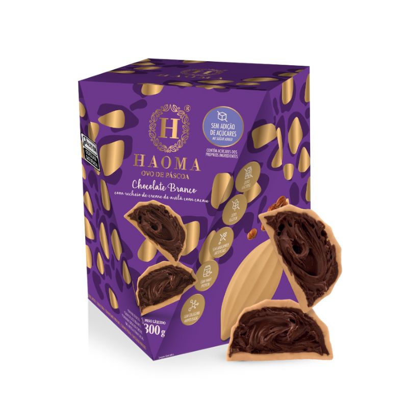 <h2 style="text-align: justify;"><strong>Ovo de Páscoa de Chocolate Branco recheado com Creme de Avelã com Cacau 300g</strong></h2> <p style="text-align: justify;">O <strong>Ovo de Páscoa de chocolate branco com recheio de creme de avelã com cacau Haoma, </strong>contém duas bandas de ovo, elaborado com ingredientes nobres, como o cacau genuinamente brasileiro, whey protein, colágeno hidrolisado, além de ser cremoso e delicioso e sem adição de açúcar.</p> <h2 style="text-align: justify;"><strong>Motivos para escolher o produto:</strong></h2> <p style="text-align: justify;">● Sem adição de açúcares; </p> <p style="text-align: justify;">● Elaborado com whey protein e colágeno hidrolisado; </p> <p style="text-align: justify;">● Sem adoçantes artificiais;</p> <p style="text-align: justify;">● Elaborado com ingredientes naturais;</p> <p style="text-align: justify;">● Cacau genuinamente brasileiro de qualidade.</p> <h2 style="text-align: justify;"><strong>A Marca</strong></h2> <p style="text-align: justify;">A Haoma foi criada no início de 2017, com o intuito de oferecer chocolates e doces exclusivos, que fossem realmente saudáveis e saborosos, compostos apenas por ingredientes naturais, com sofisticação e requinte em cada detalhe. Neste pequeno espaço de tempo, a Haoma apresentou um crescimento meteórico e hoje é a principal referência em doces saudáveis do país.</p> <p style="text-align: justify;"> </p>
