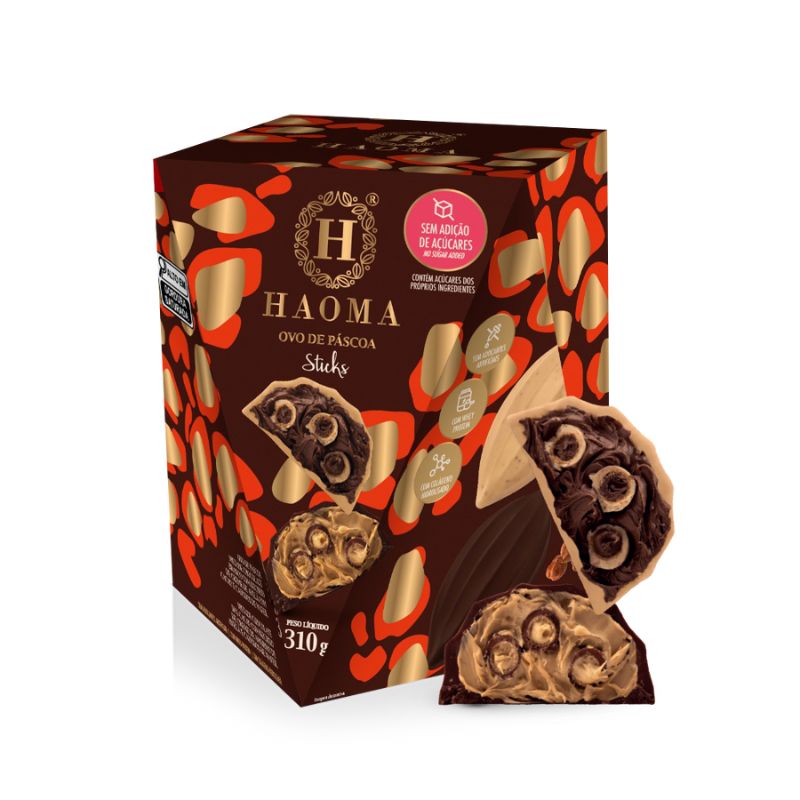 <h2 style="text-align: justify;"><strong>Ovo de Páscoa Sticks 310g</strong></h2> <p style="text-align: justify;">O <strong>Ovo de Páscoa de chocolate branco com recheio de creme de avelã com cacau e sticks Haoma, </strong>contém duas bandas de ovo, elaborado com ingredientes nobres, como o cacau genuinamente brasileiro, whey protein, colágeno hidrolisado, além de ser cremoso e delicioso e sem adição de açúcar.</p> <h2 style="text-align: justify;"><strong>Motivos para escolher o produto:</strong></h2> <p style="text-align: justify;">● Sem adição de açúcares; </p> <p style="text-align: justify;">● Elaborado com whey protein; </p> <p style="text-align: justify;">● Sem adoçantes artificiais;</p> <p style="text-align: justify;">● Elaborado com ingredientes naturais.</p> <h2 style="text-align: justify;"><strong>A Marca</strong></h2> <p style="text-align: justify;">A Haoma foi criada no início de 2017, com o intuito de oferecer chocolates e doces exclusivos, que fossem realmente saudáveis e saborosos, compostos apenas por ingredientes naturais, com sofisticação e requinte em cada detalhe. Neste pequeno espaço de tempo, a Haoma apresentou um crescimento meteórico e hoje é a principal referência em doces saudáveis do país.</p>