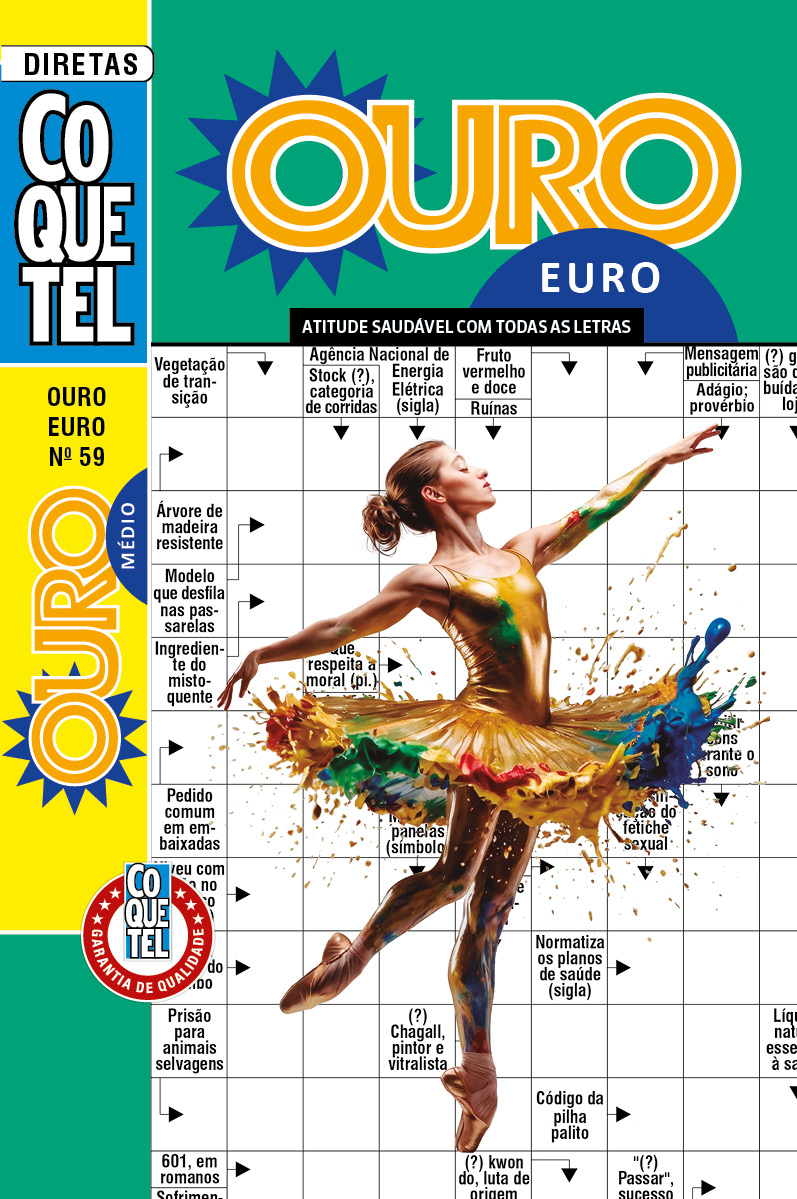 Um clássico moderno: o passatempo que combina desafio, diversão e saúde mental!Nível médio128 páginas Diversidade de passatempos: diretas, caça-palavras, caça-resposta, criptocruzadas, criptogramas, dominox, jogo dos erros, numerox, sudoku, torto, cruzadox, duplex, problema de lógica e muito mais.Ideal para adultos que buscam momentos de relaxamento com foco, concentração e estimulação cognitiva leve.O livro  Ouro Euro Coquetel  reúne o melhor dos passatempos clássicos em uma edição moderna e envolvente, perfeita para quem deseja exercitar o cérebro com leveza e prazer. Com 128 páginas e nível médio de dificuldade, esta coletânea inclui desafios variados como Palavras Diretas, Caça-palavras, Criptograma, Criptocruzada, Sudoku, Cruzadox, Dominox, Jogo dos Erros, Problemas de Lógica, Numerox e outros formatos que estimulam diferentes áreas do raciocínio. Ideal para adultos que valorizam o tempo offline, querem manter a mente ativa e buscam uma alternativa saudável à rotina digital. Com a curadoria editorial da Coquetel, sinônimo de tradição e qualidade, esta edição é uma ótima escolha para leitores que desejam relaxar com inteligência e diversão.