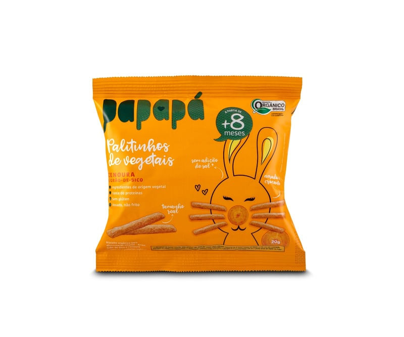 <p>Os <strong>Palitinhos de vegetais com cenoura e grão-de-bico da Papapá</strong> são o lanchinho perfeito para o seu filho, eles são elaborados com ingredientes naturais e orgânicos, e fornecem 2,0 g de proteínas na porção.</p> <h2><strong>Sugestão de consumo:</strong></h2> <p>Indicado para bebês a partir de 8 meses de idade, não havendo restrições para crianças maiores.</p> <h2><strong>Motivos para escolher o produto:</strong></h2> <ul> <li> <p>Sem de conservantes e corantes;</p> </li> <li> <p>Sem adição de açúcares e sal;</p> </li> <li> <p>Prático para consumo;</p> </li> <li> <p>Sem lactose e sem glúten;</p> </li> <li> <p>É assado;</p> </li> <li> <p>Não contém ovos, castanhas, leites e derivados;</p> </li> <li> <p>Feito com ingredientes naturais e orgânicos;</p> </li> <li> <p>Contém 18% da ingestão diária recomendada de proteínas para crianças de 7 a 11 meses de idade.</p> </li> </ul> <h2><strong>A Marca</strong></h2> <p>A Papapá é uma marca comprometida em oferecer opções práticas, saudáveis, naturais, usando orgânicos sempre que possível, promovendo uma introdução alimentar natural para o bebê e tranquila para você! </p> <p> </p>