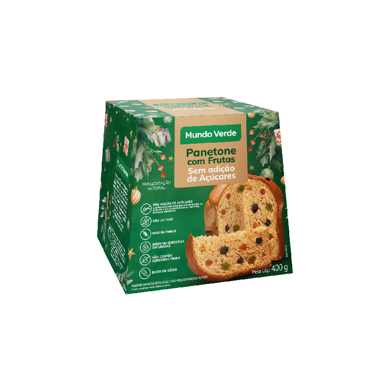 <h2 style="text-align: justify;"><strong>PANETONE COM FRUTAS SEM ADIÇÃO DE AÇÚCARES 400 G MUNDO VERDE </strong></h2> <p style="text-align: justify;">O <strong>Panetone com frutas zero açúcar Mundo Verde</strong> é um panetone sem adição de açúcar, sem lactose produzido com muitas frustas cristalizadas. Produzido atraves de fermentação natural possui uma textura macia e leve, ideal para quem é apaixonado por essa delícia tão tradicional, mas possui restrição ao consumo de açúcares.</p> <h2 style="text-align: justify;"><strong>Sugestão de consumo:</strong></h2> <p style="text-align: justify;">Consuma uma fatia no café da manhã, lanche da tarde ou até mesmo de sobremesa, esse panetone delicioso combina bem a qualquer momento.</p> <h2 style="text-align: justify;"><strong>Motivos para escolher o produto:</strong></h2> <ul style="text-align: justify;"> <li>Sem adição de açúcares; </li> <li>Sem lactose;</li> <li>Rico em fibras;</li> <li>Baixo em gorduras saturadas;</li> <li>Não contém gordura trans;</li> <li>Baixo em sódio;</li> <li>Massa preparada a partir de fermentação natural.</li> </ul> <h2 style="text-align: justify;"><strong>A Marca</strong></h2> <p style="text-align: justify;">O Mundo Verde nasceu em 1987 e acredita que uma vida saudável e equilibrada é um direito de todos. Por isso, dedica os esforços em criar e oferecer produtos de alta qualidade, cuidadosamente selecionados e formulados para atender às necesidades de todos os clientes.</p> <p style="text-align: justify;"> </p>