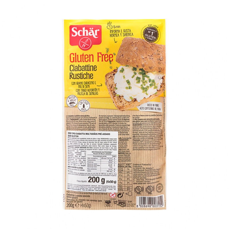 <p>A <strong>Ciabatta Integral Sem Glúten</strong>, da <strong>Schar</strong>, é elaborada com ingredientes integrais, como trigo sarraceno e sementes de girassol, sendo uma boa fonte de fibras. É pré-assado e livre de glúten e lactose.</p> Recomendação de consumo: <p>Antes de levar ao forno, umedecer levemente os pães com água e assar por 10 minutos no forno preaquecido a 200º ou até ficar com a coloração desejada.</p> Alérgicos: <p>Contém derivados de soja.</p> Por que escolher esse produto? <ul> <li>Sem gorduras trans</li> <li>Sem glúten</li> <li>Mais prática – Pronta em apenas 10 minutos</li> <li>Fonte de fibras- com 3,4 g por porção</li> <li>Sem conservantes</li> <li>Sem ovos</li> <li>Sem leite e lactose</li> </ul> Sobre a marca: <p>A Schär é líder mundial em produtos sem glúten, e está presente em cerca de 60 países. A marca tem como objetivo oferecer qualidade de vida e alimentos que dão prazer ao se alimentar, pensando nos indivíduos celíacos ou que optaram por uma dieta sem glúten. Os produtos da marca não possuem conservantes, aditivos artificiais ou alimentos transgênicos, ela preza por alimentos de alto valor nutricional e ingredientes funcionais.</p> <p></p> <p> </p>