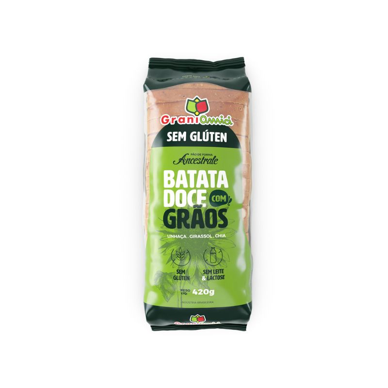 <h2 style="text-align: justify;"><strong>Pão de Forma Ancestrale Batata Doce com Grãos Grani Amici 420g</strong></h2> <h2 style="text-align: justify;">O <strong>Pão de forma Ancestrale </strong>sabor<strong> Batata Doce Grani com Grãos Amici</strong>, é elaborado com farinhas sem glúten, semente de chia, farinha de linhaça e semente de girassol, sem adição de leite em uma nova receita super macia e nutritiva, perfeito para um lanche da manhã ou tarde com praticidade e sabor.</h2> <h2 style="text-align: justify;"><strong>Sobre os ingredientes:</strong></h2> <h2 style="text-align: justify;"><strong>Alérgicos</strong>: contém ovos. <br /><strong>Pode conter:</strong> soja, amêndoas e castanha do caju.</h2> <h2 style="text-align: justify;"><strong>Sugestão de consumo:</strong></h2> <h2 style="text-align: justify;">Ideal para consumir em lanches intermediários. Sua textura é muito macia e não tem a necessidade de aquecer as fatias antes de consumi-las.</h2> <h2 style="text-align: justify;"><strong>Motivos para escolher o produto:</strong></h2> <h2 style="text-align: justify;">● Produto sem glúten; </h2> <h2 style="text-align: justify;">● Sem lactose;</h2> <h2 style="text-align: justify;">● Sem leite (APLV);</h2> <h2 style="text-align: justify;">● Contém grãos integrais;</h2> <h2 style="text-align: justify;">● Sem aromas artificiais.</h2> <h2 style="text-align: justify;"> </h2> <h2 style="text-align: justify;"><strong>A Marca</strong></h2> <h2 style="text-align: justify;">Fundada em 2010, a Grani Amici tem o propósito de oferecer bem-estar e inclusão às pessoas com intolerâncias e alergias alimentares, através da fabricação dos melhores panificados livres de glúten, leite e lactose! Os alimentos Grani Amici são elaborados com a segurança que nossos consumidores merecem e precisam. Destinados a todos aqueles que querem viver livres de preocupações na hora de se alimentar!</h2>