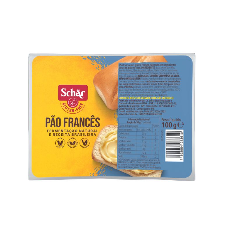 <h2 style="text-align: justify;"><strong>Pão tipo francês sem glúten e sem lactose 100g Schär </strong></h2> <h2 style="text-align: justify;">O <strong>Pão tipo francês</strong> sem glúten e lactose <strong>Schär</strong>, é elaborado através de fermentação natural, com ingredientes como psyllium, alfarroba, extrato de maçã e fibra de bambu. Perfeito para o café da manhã e lanches intermediários leves e saudáveis, sem glúten, leite e lactose.</h2> <h2 style="text-align: justify;"><strong>Sobre os ingredientes:</strong></h2> <h2 style="text-align: justify;"><strong>Alérgicos</strong>: contém derivados de soja.</h2> <h2 style="text-align: justify;"><strong>Sugestão de consumo:</strong></h2> <h2 style="text-align: justify;">Para uma casquinha crocante por fora, não esqueça de finalizá-lo corretamente: umedeça por fora e leve ao forno pré-aquecido de 8 a 10 minutos.</h2> <h2 style="text-align: justify;">Consuma no café da manhã ou lanches intermediários. Como lanches escolares, trabalho, academia e/ou faculdade. </h2> <h2 style="text-align: justify;"><strong>Motivos para escolher o produto:</strong></h2> <h2 style="text-align: justify;">● Produto sem glúten; </h2> <h2 style="text-align: justify;">● Sem lactose;</h2> <h2 style="text-align: justify;">● Sem leite (APLV);</h2> <h2 style="text-align: justify;">● Sem ovos;</h2> <h2 style="text-align: justify;">● Sem conservantes;</h2> <h2 style="text-align: justify;">● Vegano;</h2> <h2 style="text-align: justify;">● Elabora com psyllium, contém fibras.</h2> <h2 style="text-align: justify;"> </h2> <h2 style="text-align: justify;"><strong>A Marca</strong></h2> <h2 style="text-align: justify;">Feito com o melhor de nós</h2> <h2 style="text-align: justify;">Inaugurada em 1922, a Schär, acredita que não importa o quanto as coisas possam mudar, a comida sempre terá o poder de nos unir. A melhor maneira de fazer com que todos se sintam em casa é preparar uma refeição na qual cada um esteja incluído. É por isso que a Schär utiliza apenas os <strong>melhores cereais e grãos</strong> para adaptar aos gostos e necessidades únicas de cada um. “Pois o mais importante não é só desenvolver <strong>produtos sem glúten</strong>, mas também fazê-los com o melhor de nós.”</h2>