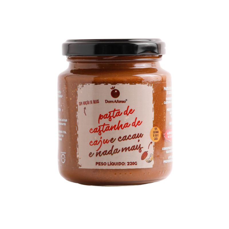 <h2 style="text-align: justify;"><strong>Pasta de Castanha de Caju com Cacau Dom Afonso 220g</strong></h2> <p style="text-align: justify;">A <strong>Pasta de castanha de caju </strong>com Cacau <strong>Dom Afonso</strong>, é elaborada com 100% amêndoas de castanhas de caju selecionadas e nada mais. Assim como todos os produtos Dom Afonso, a pasta também não possui aditivos químicos, corantes, conservantes e nem sabores artificiais.</p> <h2 style="text-align: justify;"><strong>Sugestão de consumo:</strong></h2> <p style="text-align: justify;">Pode ser consumida junto com pães, torradas, biscoitos e consumida nos mais variados horários, desde o café da manhã ao lanche da tarde e noite. Adicionada em shakes e smoothies, com frutas ou em receitas culinárias como panquecas, bolos, pães e é um excelente pré e pós treino.</p> <h2 style="text-align: justify;"><strong>Motivos para escolher o produto:</strong></h2> <p style="text-align: justify;">● 100% amêndoas de caju – Integral;</p> <p style="text-align: justify;">● Sempre cremosa;</p> <p style="text-align: justify;">● Sem aditivos químicos;</p> <p style="text-align: justify;">● Sem conservantes, aromatizantes e corantes;</p> <p style="text-align: justify;">● Sem adição de açúcares; </p> <p style="text-align: justify;">● Sem adição de óleos; </p> <p style="text-align: justify;">● Sem adição de sal;</p> <p style="text-align: justify;">● Vegano.</p> <h2 style="text-align: justify;"><strong>A Marca</strong></h2> <p style="text-align: justify;">Dom Afonso produz Manteiga Ghee, grass fed; Snack de Parmesão Crocante, zero carboidratos e Pasta de Castanha de Caju 100% integral. Todos os produtos são considerados clean label - sem conservantes, sem aditivos químicos, sem corantes e sem aromatizantes.</p>