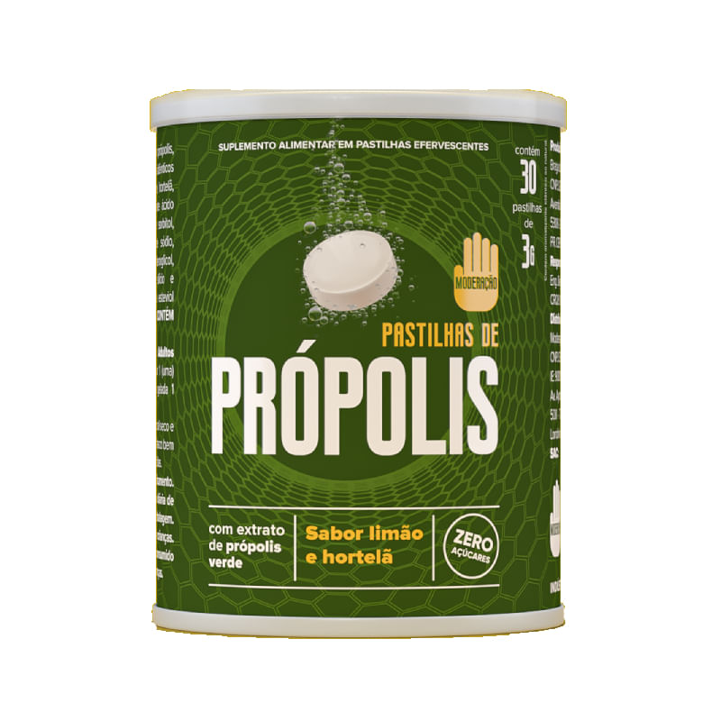 <p>As pastilhas efervescentes da Moderação são elaboradas com extrato de própolis verde, fornecendo altas concentrações de compostos fenólicos. Possui sabor suave de limão e hortelã, facilitando o consumo no dia a dia.</p> <h2><strong>Sugestão de consumo:</strong></h2> <p>Diluir em água 1 pastilha efervescente e consumir uma vez ao dia, ou conforme orientação do médico ou nutricionista. </p> <h2><strong>Motivos para escolher o produto:</strong></h2> <ul> <li> <p>Sem glúten e sem lactose;</p> </li> <li> <p>Sem açúcar;</p> </li> <li> <p>21mg de compostos fenólicos por dose;</p> </li> <li> <p>Sabor suave de limão e hortelã;</p> </li> <li> <p>Zero calorias; </p> </li> </ul> <h2><strong>A Marca:</strong></h2> <p>A Moderação é uma marca que nasceu em 2019 com a missão de unir praticidade de consumo com fórmulas diferenciadas, desenvolvidas especialmente por nutricionistas com ingredientes naturais, sem deixar de lado a qualidade e sustentabilidade.</p> <p> </p>