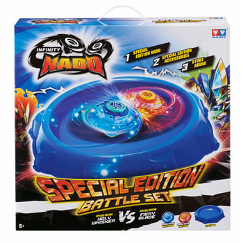 Infinity Nado apresenta piões de alta performance, perfeitos para Batalhas épicas. Com o Infinity Nado – Battle Set a brincadeira será completa! Ele possui todos as ferramentas ideais para um grande combate. Acompanha dois nados, duas ferramentas, dois lançadores, duas cordas e arena de combate. A Batalha vai ficar muito mais emocionantes com Infinity Nado – Battle Set.