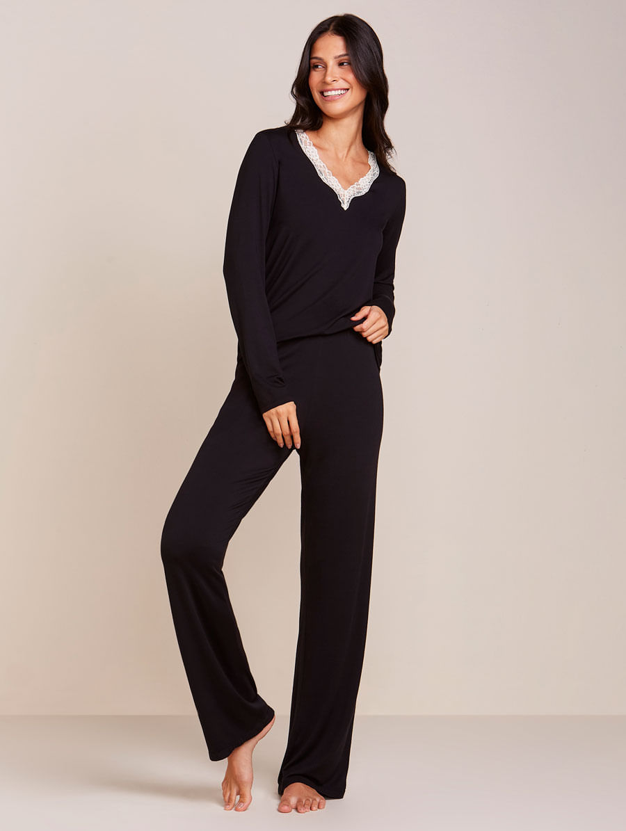 Pijama Longo Decote V Em Viscose E Renda Moon - Preto - P - 0MCL1650-PTO-P