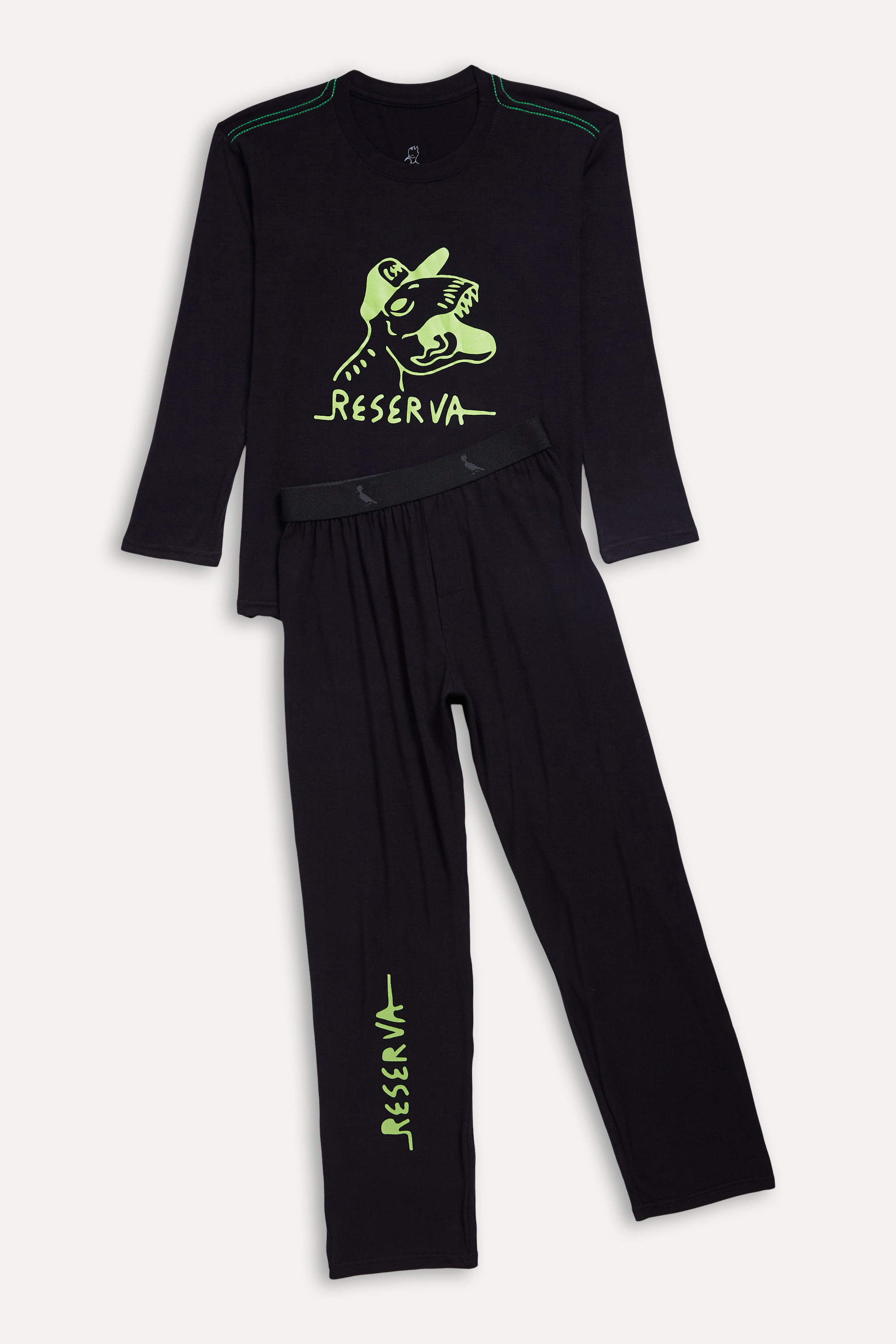 Pijama Mini manga longa estampado. Feito em tecido super confortável. De manga longa e calça comprida com estampa exclusiva Reserva Mini que brilha no escuro, pra deixar a hora de dormir ainda mais divertida.. A calça tem um elástico personalizado na cintura com a marca da Reserva o Pica-Pau. Comprando esta peça, você complementa cinco pratos de comida através do nosso programa 1P=5P.