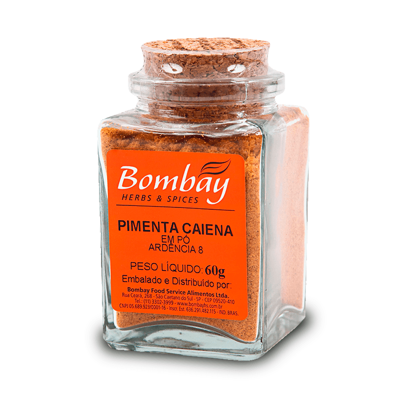 <p>Informações técnicas sobre o produto:<br>A Pimenta Caiena em pó, da Bombay, 60g, é quente e saborosa! Quando consumida regularmente pode trazer diversos benefícios ao organismo, pois além de ser estimulante do metabolismo, é fonte de vitamina A e C!<br><br>Utilize para temperar carnes, peixes, frangos, omeletes, saladas e o arroz, ou na preparação de molhos, sopas, caldos e sucos.<br><br>Recomendações de consumo:<br>Experimente utilizar esta versão em pó para preparar batidas de whey com banana, ou adicioná-la ao chá verde, ou ao chá de gengibre!<br><br>Por que escolher esse produto? <br>· Sem glúten<br><br>· Livre de OGM (organismos geneticamente modificados)<br><br>· Sem adição de corantes<br><br>· Pronto para uso<br><br>Sobre a marca:<br>A Bombay Herbs & Spices é reconhecida como a empresa com maior variedade neste segmento. Foi idealizada para atender a demanda de ervas, especiarias e pimentas de alta qualidade de todos os clientes apaixonados pela gastronomia. Já conta com mais de 500 produtos, 100% puros e com uma infinidade de sabores.</p>