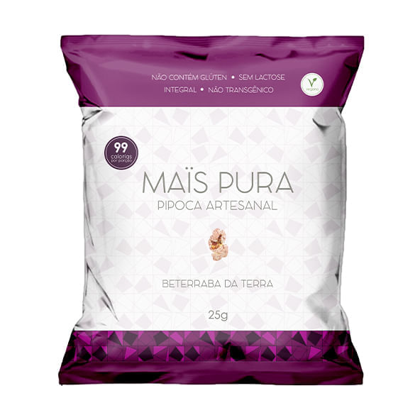 Informações técnicas sobre o produto:<br> <br> A Pipoca Artesanal Sabor Beterraba da Terra, da Mais Pura, é uma pipoca gourmet feita com milho para pipoca não transgênico. Sua produção é artesanal, com ingrediente de alta qualidade e integrais, sem componentes de origem animal, conservantes ou ingredientes alergênicos.<br> Sobre os ingredientes:<br> <br> • Milho: Devido a presença de carboidratos, pode ser considerado como fonte de energia. Além disso, também possui antioxidantes, vitaminas e minerais, auxiliando na manutenção da saúde.<br> • Beterraba: Rica em antioxidantes, vitaminas e minerais. <br> • Óleo de Girassol: Rico em vitamina E, funcionando como importante antioxidante.<br> • Sal Marinho: Por ser manualmente raspado da superfície de lagos de evaporação não é muito processado e mantém os sais minerais.<br> <br> Recomendações de consumo:<br> A pipoca artesanal de beterraba da terra pode ser consumida nas refeições intermediárias e principalmente em lanches rápidos oferecendo sabor e praticidade.<br> Por que escolher esse produto?<br> • Sem glúten <br> • 99 calorias na porção<br> • Vegana<br> • Sem lactose<br> • Sem gordura trans<br> • Sem conservantes<br> • Sem ingredientes de origem animal<br> • Não transgênico<br> • Sem ingredientes alergênicos<br> Sobre a marca:<br> A Mais Pura é uma marca de snacks saudáveis. As pipocas artesanais (pipoca doce e salgada) são o ponto de partida para um portfólio saboroso de alimentos práticos e saudáveis. A empresa tem como objetivo, oferecer produtos saudáveis e sustentáveis, de elevada qualidade. Deixando a vida de seus consumidores leve, prática e saborosa.