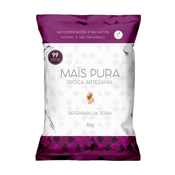 Informações técnicas sobre o produto:<br> <br> A Pipoca Artesanal Sabor Beterraba da Terra, da Mais Pura, 50g, é uma pipoca gourmet feita com milho para pipoca não transgênico. Sua produção é artesanal, com ingrediente de alta qualidade e integrais, sem componentes de origem animal, conservantes ou ingredientes alergênicos.<br> <br> Sobre os ingredientes:<br> <br> • Milho: Devido a presença de carboidratos, pode ser considerado como fonte de energia. Além disso, também possui antioxidantes, vitaminas e minerais, auxiliando na manutenção da saúde.<br> • Beterraba: Rica em antioxidantes, vitaminas e minerais. <br> • Óleo de Girassol: Rico em vitamina E, funcionando como importante antioxidante.<br> • Sal Marinho: Por ser manualmente raspado da superfície de lagos de evaporação não é muito processado e mantém os sais minerais.<br> Recomendações de consumo:<br> A pipoca artesanal de beterraba da terra pode ser consumida nas refeições intermediárias e principalmente em lanches rápidos oferecendo sabor e praticidade.<br> Por que escolher esse produto?<br> • Sem glúten <br> • 99 calorias na porção<br> • Vegana<br> • Sem lactose<br> • Sem gordura trans<br> • Sem conservantes<br> • Sem ingredientes de origem animal<br> • Não transgênico<br> • Sem ingredientes alergênicos<br> Sobre a marca:<br> A Mais Pura é uma marca de snacks saudáveis. As pipocas artesanais (pipoca doce e salgada) são o ponto de partida para um portfólio saboroso de alimentos práticos e saudáveis. A empresa tem como objetivo, oferecer produtos saudáveis e sustentáveis, de elevada qualidade. Deixando a vida de seus consumidores leve, prática e saborosa.
