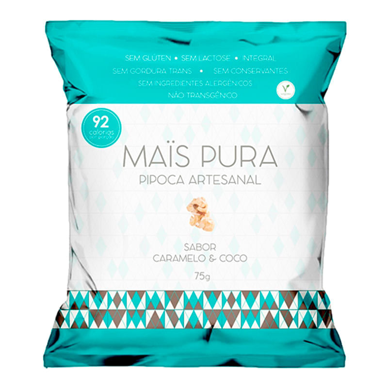 Informações técnicas sobre o produto:<br> A Pipoca Artesanal Sabor Caramelo e Coco, da Mais Pura, 75g, é uma pipoca gourmet sem aromas, corantes e conservantes. Sua produção é artesanal, com ingrediente de alta qualidade e integrais, sem componentes de origem animal. Além disso, o milho, principal ingrediente, não é transgênico e possui origem controlada.<br> <br> Recomendações de consumo:<br> A pipoca artesanal pode ser consumida nas refeições intermediárias, como lanche ou até mesmo sobremesa, e pela praticidade pode ser consumida em qualquer local.<br> <br> Por que escolher esse produto?<br> Isento de glúten<br> Sem lactose<br> Livre de conservantes<br> Sem gordura trans<br> Milho não transgênico<br> Sem ingredientes de origem animal<br> Sem alergênicos<br> Sobre a marca:<br> A Maïs Pura é uma marca de snacks saudáveis. As pipocas artesanais (pipoca doce e salgada) são o ponto de partida para um portfólio saboroso de alimentos práticos e saudáveis. A empresa tem como objetivo, oferecer produtos saudáveis e sustentáveis, de elevada qualidade. Deixando a vida de seus consumidores leve, prática e saborosa.
