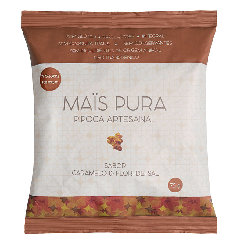 <p>O<strong> Pipoca Artesanal Caramelo e Flor de Sal Maïs Pura 75g </strong>é uma pipoca gourmet estourada, crocante, deliciosa e irresistível. São produzidas com grãos 100% integrais de alta qualidade, além de não possuir gordura trans e conservantes.</p> Sobre os ingredientes: <p>Milho de pipoca: é um alimento fonte de vitaminas do complexo B e fibras, além disso o milho contém polifenóis, que são poderosos antioxidantes.</p> <p>Açúcar mascavo: rico em cálcio, magnésio, fósforo e potássio.</p> <p>Flor de sal: é fonte natural de ferro, zinco, iodo, magnésio, flúor, sódio, potássio, cálcio e cobre. Todos esses minerais permanecem, pois o sal não passa por nenhum processo posterior à sua retirada do mar.</p> <p>Contém derivados de soja. Pode conter traços de nozes pecan.</p> Sugestão de consumo: <p>Produto pronto para o consumo, ótimo opção para snack que pode ser consumido a qualquer hora do dia.</p> Motivos para escolher o produto: <ul> <li> <p>Não contém Glúten</p> </li> <li> <p>Sem lactose</p> </li> <li> <p>Isento de produtos de origem animal</p> </li> <li> <p>Prático</p> </li> <li> <p>Livre de aromatizantes</p> </li> <li> <p>Sem conservantes</p> </li> <li> <p>Apenas 41 kcal por porção</p> </li> </ul> Sobre a marca: <p>Os produtos <strong>Mais Pura</strong> são feitos com ingredientes especiais e de maneira artesanal, nossos snacks são uma opção rápida e saudável para qualquer momento do dia. Mantivemos o aroma natural, a textura crocante e nos livramos dos corantes e conservantes pensando em você, que se preocupa com a saúde, mas não abre mão dos pequenos prazeres da vida<strong>.</strong> Experimente e se surpreenda.</p>