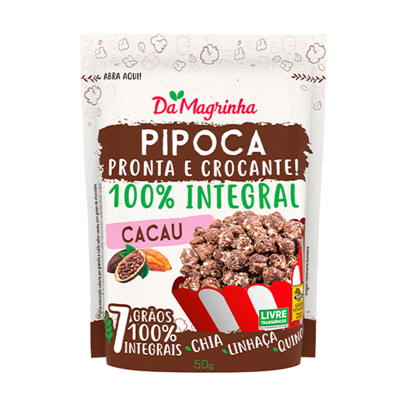 Informações técnicas sobre o produto:<br> A Pipoca estourada 100% integral – 7 grãos – cacau, da Da Magrinha, 50g, é uma pipoca coberta por granola e calda sabor cacau, com gotas de chocolate.<br> <br> Formulada com ingredientes integrais, livre de transgênicos, como: aveia, chia, linhaça marrom, gergelim, flocos de arroz integral e quinoa, além do cacau e gotas de chocolate.<br> <br> Sobre alguns dos ingredientes:<br> Aveia: é uma boa fonte de proteínas, e vitaminas do complexo B e minerais como cálcio, ferro, fósforo, potássio e magnésio. É rica também em fibras.<br> Chia: é uma ótima fonte de ômega-3 e vitaminas, como as do complexo B, e minerais como cálcio, ferro, zinco e magnésio.<br> Quinoa: boas quantidades de fibras e ômega 3 e 6, além de vitaminas A, E, B6 e B1, e minerais como fósforo, magnésio, zinco e ferro.<br> Milho de pipoca: é um alimento fonte de vitaminas do complexo B e rico em fibras, além de conter polifenóis, que são considerados importantes antioxidantes.<br> Cacau: rico em minerais como magnésio e potássio, além de antioxidantes polifenóis e flavonoides.<br> Informações sobre Alergênicos:<br> Contém aveia, derivados de cevada e derivados de soja. Pode conter centeio, trigo, leite, amêndoas, castanha de caju, castanha do Pará, amendoim, pistache, macadâmia e avelã.<br> <br> Recomendações de preparo e consumo:<br> Uma ótima opção de snack prático, e pode ser consumido como uma opção nos lanches intermediários ou a qualquer hora do dia e em qualquer lugar.<br> <br> Por que escolher esse produto?<br> Naturalmente isento de colesterol<br> Fonte de fibras<br> Livre de Transgênicos<br> Sobre a marca:<br> A Da Magrinha é a 1ª marca do Brasil com tudo 100% integral. Tudo 100% assado, com Certificado Internacional Whole Grain, livre de transgênicos, 7 grãos nobres, embalagens em stand up pouch com zíper que abre e fecha, e com 40% de redução de plásticos. Produtos artesanais, saudáveis, gostosos e integral de verdade!