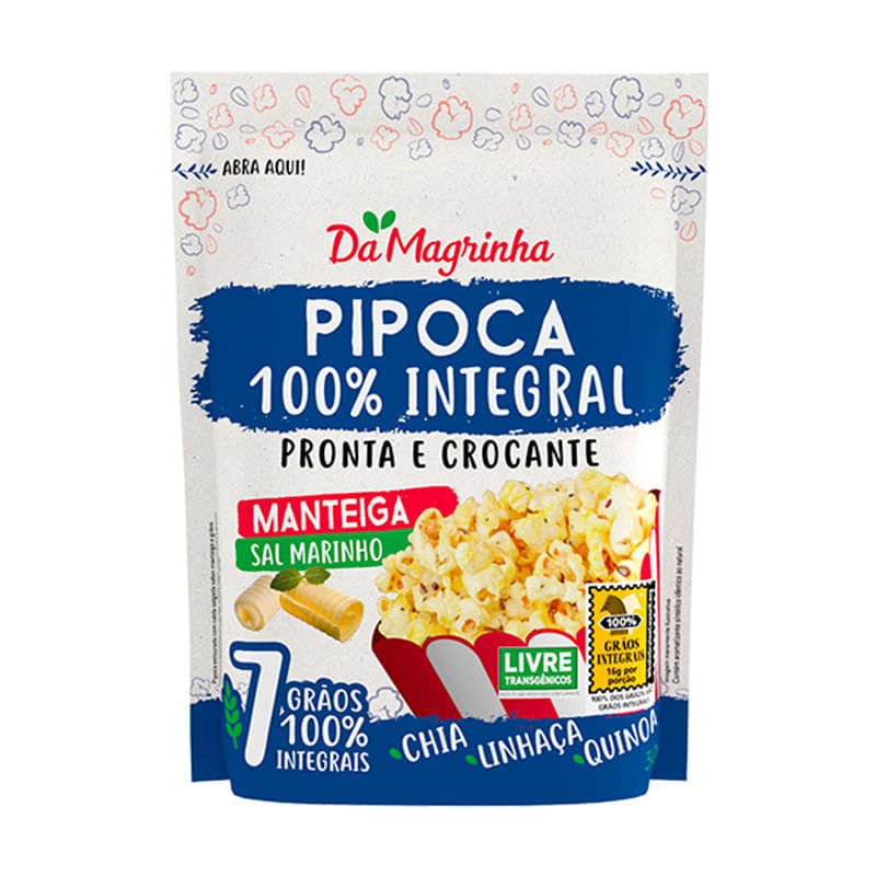 Informações técnicas sobre o produto:<br> A Pipoca estourada salgada 100% integral – 7 grãos – manteiga, da Da Magrinha, 30g, é uma pipoca com calda salgada sabor manteiga e grãos.<br> <br> Formulada com ingredientes integrais, livre de transgênicos, como: chia, linhaça, gergelim, quinoa e aveia, além de sal marinho e extrato de alecrim.<br> <br> Sobre alguns dos ingredientes:<br> Milho de pipoca: é um alimento fonte de vitaminas do complexo B e rico em fibras, além de conter polifenóis, que são considerados importantes antioxidantes.<br> Chia: é uma ótima fonte de ômega-3 e vitaminas, como as do complexo B, e minerais como cálcio, ferro, zinco e magnésio.<br> Quinoa: boas quantidades de fibras e ômega 3 e 6, além de vitaminas A, E, B6 e B1, e minerais como fósforo, magnésio, zinco e ferro.<br> Aveia: é uma boa fonte de proteínas, e vitaminas do complexo B e minerais como cálcio, ferro, fósforo, potássio e magnésio. É rica também em fibras.<br> Sal marinho: ingrediente com presença de alguns micronutrientes, além de possuir menor teor de sódio, em comparação aos sais tradicionais.<br> Informações sobre Alergênicos:<br> Contém aveia e derivados de soja. Pode conter centeio, trigo, leite, amêndoas, castanha de caju, castanha do Pará, amendoim, pistache, macadâmia, cevada e avelã.<br> <br> Recomendações de preparo e consumo:<br> Uma ótima opção de snack prático, e pode ser consumido como uma opção nos lanches intermediários ou a qualquer hora do dia e em qualquer lugar.<br> <br> Por que escolher esse produto?<br> Naturalmente isento de colesterol<br> Fonte de fibras<br> Livre de Transgênicos<br> Sobre a marca:<br> A Da Magrinha é a 1ª marca do Brasil com tudo 100% integral. Tudo 100% assado, com Certificado Internacional Whole Grain, livre de transgênicos, 7 grãos nobres, embalagens em stand up pouch com zíper que abre e fecha, e com 40% de redução de plásticos. Produtos artesanais, saudáveis, gostosos e integral de verdade!