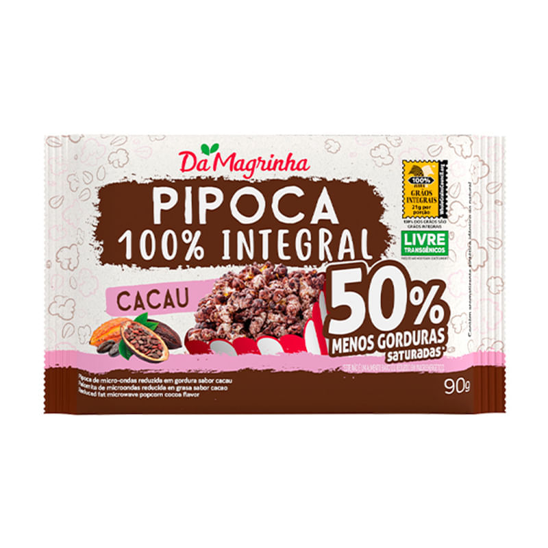 Informações técnicas sobre o produto:<br> A Pipoca de micro-ondas reduzida em gordura sabor cacau, da Da Magrinha, 90g, é uma pipoca que leva em sua composição milho não transgênico, cacau lecitinado e sal marinho. Além de ter uma redução de 38% de gorduras totais e 50% menos gorduras saturadas.<br> <br> Sobre alguns dos ingredientes:<br> Milho de pipoca: é um alimento fonte de vitaminas do complexo B e rico em fibras, além de conter polifenóis, que são considerados importantes antioxidantes.<br> Cacau lecitinado: rico em minerais como magnésio e potássio, além de antioxidantes polifenóis e flavonoides.<br> Sal marinho: ingrediente com presença de alguns micronutrientes, além de possuir menor teor de sódio, em comparação aos sais tradicionais.<br> Informações sobre Alergênicos:<br> Contém derivados de soja.<br> <br> Recomendações de preparo e consumo:<br> Retire a embalagem plástica e coloque o pacote de papel desdobrado no forno de micro-ondas, com o lado das instruções virado para cima.<br> Programe o seu forno de micro-ondas, na potência máxima de 2 a 3 min e 30 segundos, dependendo da potência de seu micro-ondas.<br> Ouça atentamente as explosões. Pare o micro-ondas quando o intervalo entre os estouros for de 2 a 3 segundos.<br> Retire o pacote e abra puxando as abas laterais. Abra o pacote longe do rosto e com cuidado pois o vapor estará muito quente!<br> Uma ótima opção de snack prático, pode ser consumido como uma opção nos lanches intermediários ou a qualquer hora do dia.<br> <br> Por que escolher esse produto?<br> Redução de 38% de gorduras totais (“Este não é um alimento baixo ou reduzido em valor energético”) *<br> 50% menos gorduras saturadas *<br> Zero gordura trans<br> Fonte de fibras<br> Livre de Transgênicos<br> *Média dos produtos similares de mercado.<br> <br> Sobre a marca:<br> A Da Magrinha é a 1ª marca do Brasil com tudo 100% integral. Tudo 100% assado, com Certificado Internacional Whole Grain, livre de transgênicos, 7 grãos nobres, embalagens em stand up pouch com zíper que abre e fecha, e com 40% de redução de plásticos. Produtos artesanais, saudáveis, gostosos e integral de verdade!