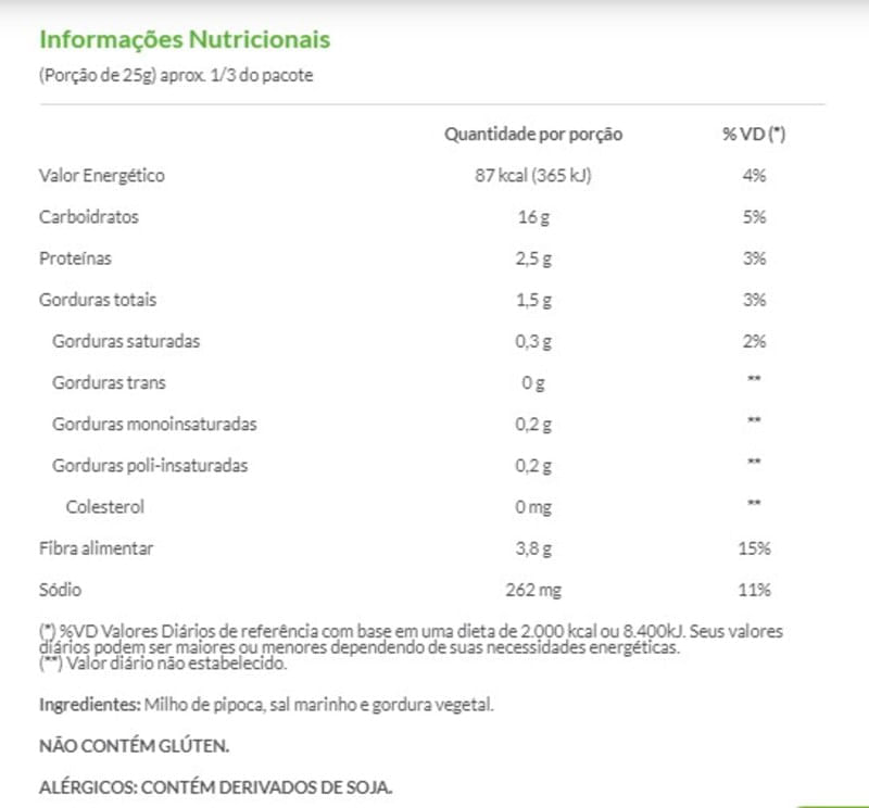 Informações técnicas sobre o produto:<br> A Pipoca de micro-ondas reduzida em gordura com sal marinho (natural), da Da Magrinha, 90g, é uma pipoca que leva em sua composição apenas três ingredientes: milho não transgênico, sal marinho e gordura vegetal. Além de ter uma redução de 68% de gorduras totais.<br> <br> Sobre alguns dos ingredientes:<br> Milho de pipoca: é um alimento fonte de vitaminas do complexo B e rico em fibras, além de conter polifenóis.<br> Sal marinho: ingrediente com presença de alguns micronutrientes, além de possuir menor teor de sódio, em comparação aos sais tradicionais.<br> Informações sobre Alergênicos:<br> Contém derivados de soja.<br> <br> Recomendações de preparo e consumo:<br> Retire a embalagem plástica e coloque o pacote de papel desdobrado no forno de micro-ondas, com o lado das instruções virado para cima.<br> Programe o seu forno de micro-ondas, na potência máxima de 2 a 3 min e 30 segundos, dependendo da potência de seu micro-ondas.<br> Ouça atentamente as explosões. Pare o micro-ondas quando o intervalo entre os estouros for de 2 a 3 segundos.<br> Retire o pacote e abra puxando as abas laterais. Abra o pacote longe do rosto e com cuidado pois o vapor estará muito quente!<br> Uma ótima opção de snack prático, pode ser consumido como uma opção nos lanches intermediários ou a qualquer hora do dia.<br> <br> Por que escolher esse produto?<br> Redução de 68% de gorduras totais (“Este não é um alimento baixo ou reduzido em valor energético”) *<br> Zero gordura trans<br> Fonte de fibras<br> Livre de Transgênicos<br> *Média dos produtos similares de mercado.<br> <br> Sobre a marca:<br> A Da Magrinha é a 1ª marca do Brasil com tudo 100% integral. Tudo 100% assado, com Certificado Internacional Whole Grain, livre de transgênicos, 7 grãos nobres, embalagens em stand up pouch com zíper que abre e fecha, e com 40% de redução de plásticos. Produtos artesanais, saudáveis, gostosos e integral de verdade!