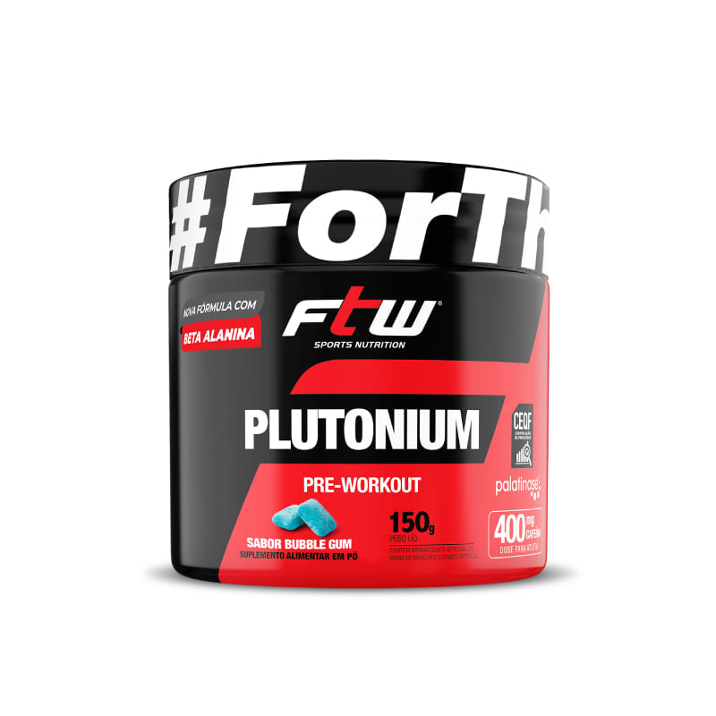 <p><span>O </span><b>Plutonium pre-workout FTW</b><span> é um suplemento alimentar em pó desenvolvido para uso pré-treino. Sua formulação combina 200 mg de cafeína por porção, com palatinose, beta-alanina e taurina, uma combinação de ingredientes selecionados, que proporcionam mais disposição e performance. Com sabor bubble gum, zero açúcar e fácil dissolução, oferece praticidade e excelente experiência sensorial.</span></p> <h2><b>Sobre os ingredientes:</b></h2> <p><b>Beta-alanina: </b><span>aminoácido que colabora com o desempenho físico.</span></p> <p><b>Palatinose®:</b><span> carboidrato que contribui com o fornecimento de energia para o organismo</span></p> <p><b>Cafeína: </b><span>a cafeína auxilia no aumento do estado de alerta e na melhora da concentração.</span></p> <h2><b>Sugestão de consumo: </b></h2> <p><span>Recomenda-se diluir 1 medida dosadora (5 g) do produto em cerca de 200 ml de água, preferencialmente gelada e consumir 1 hora antes da atividade física ou conforme orientação profissional.</span></p> <h2><b>Motivos para escolher o produto: </b></h2> <ul> <li aria-level="1"><span>Fonte de energia;</span></li> <li aria-level="1"><span>Sem adição de açúcares;</span></li> <li aria-level="1"><span>Livre de glúten.</span></li> </ul> <h2><b>A marca:</b></h2> <p><span>A </span><b>FTW</b><span> nasceu do espírito </span><i><span>For The Win</span></i><span>, com a missão de oferecer suplementos de alta qualidade para quem leva o esporte a sério. Mais do que atender às demandas do desempenho físico, a marca inspira atletas de todos os níveis a superarem seus próprios limites, com produtos desenvolvidos para potencializar resultados. Com uma linha completa e rigorosamente testada, a FTW está presente na rotina de quem busca evolução constante. Cada fórmula carrega o compromisso com a performance, a saúde e a superação.</span></p>