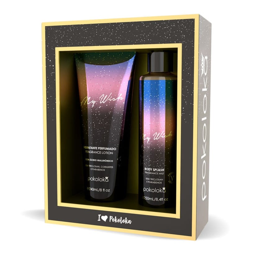 Kit My Wish 250ml-Contém 01 hidratante perfumado My Wish 240ml e 01 Body Splash My Wish 250ml;INSPIRADO NA FRAGRÂNCIA MY WAY (GIORGIO ARMANI)O HIDRATANTE PERFUMADO DESODORANTE CORPORAL MY WISH POKOLOKA contém em sua formulação ÁCIDO HIALURÔNICO poderoso ativo hidratante que auxilia na firmeza da pele. Sua fórmula possui textura leve e de fácil absorção. Sua fragrância traz aromas delicados, mas muito definidos e marcantes, com fragrância chipre floral clean, que representam a força de pessoas contemporâneas.O Body Splash My Wish Pokoloka desodorante corporal, deixa a pele suavemente perfumada ao longo do dia. É ideal para complementar o uso da loção hidratante My Wish Pokoloka.