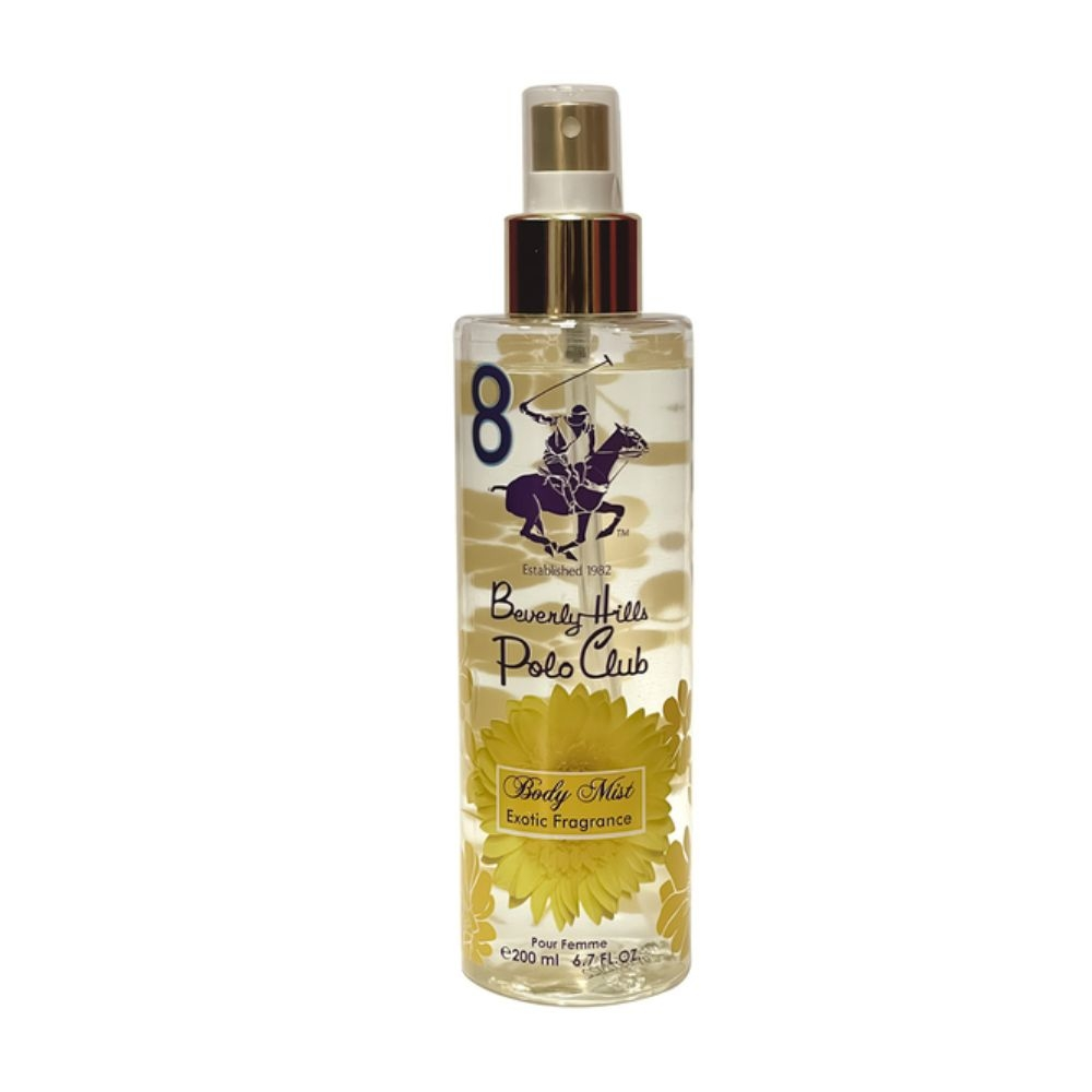 Beverly Hills Polo Club Nº8 Body Mist 200ml: sua fragrância intensa, sensual, feminina e duradoura faz você se sentir revigorada, rejuvenescida e animada o dia todo. Seja diferente, elegante e atraente o tempo todo com esta fragrância distinta.<br /> <br /> Notas:<br /> Saída: Frutas Cítricas e Maracujá.<br /> Coração: Notas Aquáticas, Florais de Jasmim aquática, Nenúfares e Folhas de Violeta.<br /> Fundo: Madeira de Cedro, Almíscar e Baunilha.