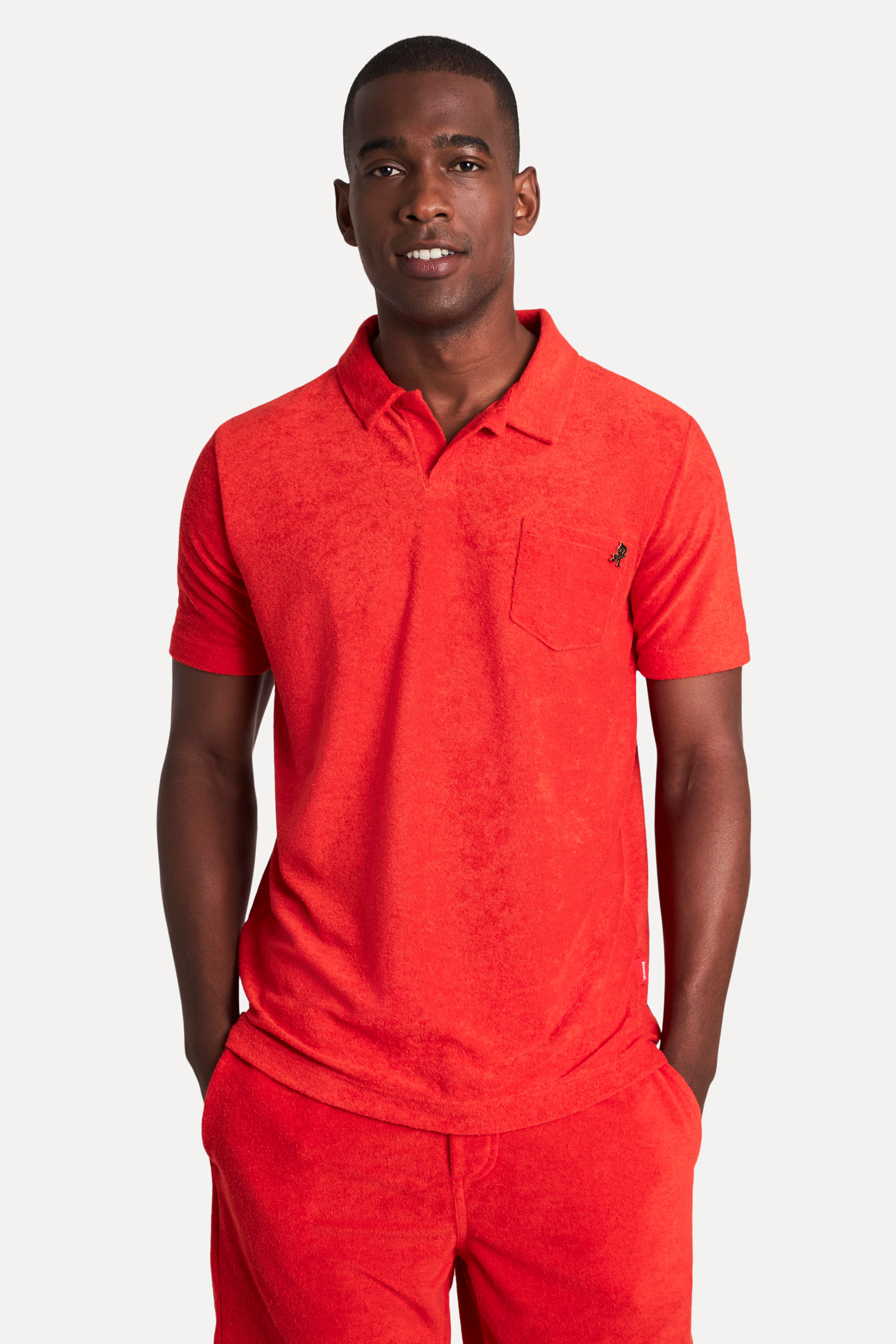 Com nossa Polo MC Atoalhada Lisa com Bolso, você pode se sentir um toque diferenciado, de um tecido leve e fresco. Feita com malha mista de algodão e poliéster, ela tem manga curta, modelagem regular e cores exclusivas. Além disso, seus detalhes únicos, como a aplicação de etiquetas decorativas, fazem toda a diferença no visual. Camisa produzida eticamente no Brasil. Comprando esta peça, você viabiliza cinco pratos de comida através do nosso programa 1P5P. O modelo tem 1,90 m de altura, 95 cm de tórax e veste M.