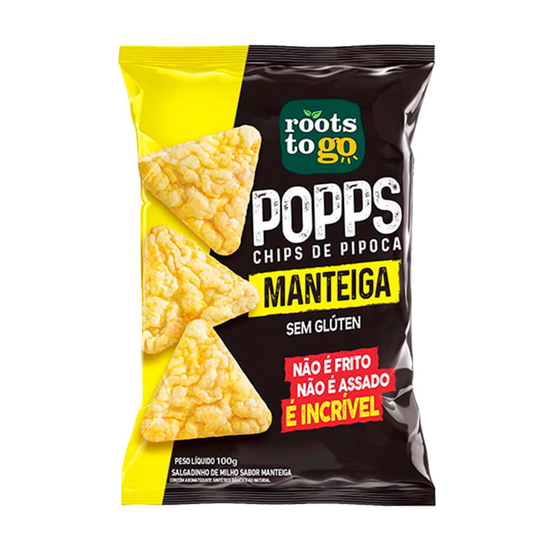Informações técnicas do produto:<br> O Popps Manteiga, da Roots to go,100g, são chips de milho crocantes e deliciosos com aroma de manteiga. Estes chips são feitos com ingredientes naturais, não são fritos, nem assados e livre de glúten e conservantes. Elaborados com uma nova tecnologia de expansão em chips, conservando a naturalidade dos ingredientes. <br> <br> Recomendações para consumo:<br> Ideal para consumir a qualquer hora do dia. Recomendado para indivíduos com intolerância a lactose e celíacos.<br> <br> Motivos para escolher esse produto?<br> Não é frito<br> Não é assado<br> Livre de glúten<br> Sem corantes<br> Não são transgênicos<br> Ingredientes naturais<br> Informações sobre a marca:<br> A Roots to Go, é uma empresa especializada em Snacks Vegetais, produzindo salgadinhos mais saudáveis do que os convencionais. A Roots traz produtos naturais, sem glúten, sem lactose para atender às mais diversas necessidades, e ainda são fabricados com ingredientes não-transgênicos para obter o verdadeiro sabor natural das raízes e frutas 100% brasileiras.