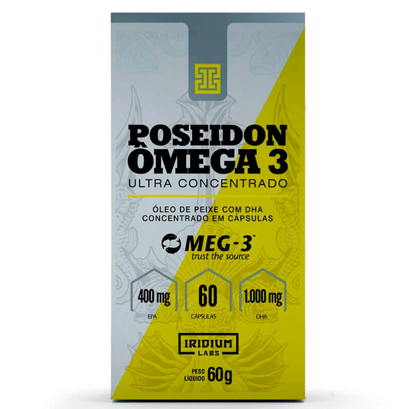 O Poseidon ômega 3 ultra concentrado, da Iridium Labs, 60 cápsulas, fornece 1000mg de DHA e 400mg de EPA na porção (2 cápsulas). Suplemento ultra concentrado, sendo 70% do conteúdo da cápsula composto por ômega-3 certificado (selo MEG-3), garantindo um produto puro, livre de metais pesados.