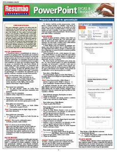 Este Resumão traz várias dicas para você aproveitar ao máximo o seu PowerPoint. Ele é dividido em cinco partes: preparação do slide de apresentação, layout e design, animação, apresentação e, por último, um quadro bastante útil com o certo e o errado da apresentação. Como usar os comentários, o slide mestre, o folheto mestre e as anotações mestras. Na parte de layout e design: como usar camadas, alterar a visibilidade, renomear e reordenar camadas, agrupar objetos, retirar planos de fundo em fotos, fazer transição de slides, adicionar áudio e vídeo, como cortar vídeo e como usar gráficos e tabelas do excel. Na parte de animação: como gerenciar as animações com o painel de animação, como mudar as opções de efeito, as trajetórias de animação e como reorganizar a animação. Na parte de apresentação: escolher a escala de cinza, preto e branco ou cores, como usar o painel de anotações e a página de notas, como salvar uma apresentação como vídeo e como transmitir um slideshow na internet.