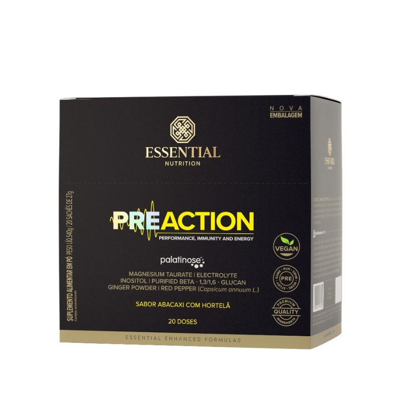 <p dir="ltr">O <strong>Pre Action</strong> sabor abacaxi e hortelã <strong>Essential Nutrition</strong>, é um suplemento vegano que une componentes de liberação prolongada e elevado potencial energético. Traz também vitaminas do complexo B, minerais, B-glucana de levedura, extrato aromático de chá verde, gengibre, pimenta e eletrólitos.</p> <h2 dir="ltr">Sobre o ingrediente:</h2> <p dir="ltr"><strong>Palatinose®: </strong>carboidrato obtido a partir da beterraba que possui baixo índice glicêmico, sendo fonte de energia constante e prolongada para o organismo.</p> <p dir="ltr"><strong>Magnésio taurato: </strong>magnésio aliado ao aminoácido taurina, que possui alta biodisponibilidade e atua em mais de 300 reações no organismo. </p> <p dir="ltr">Vitaminas complexo B: importantes para o metabolismo energético e no sistema imunológico.</p> <h2 dir="ltr">Sugestão de consumo:</h2> <p dir="ltr">Adicione um sachê (27g) em aproximadamente 350ml (1 copo grande) de água gelada e misture até a total homogeneização. Beba imediatamente após o preparo.</p> <h2 dir="ltr">Motivos para escolher o produto:</h2> <ul> <li dir="ltr"> <p dir="ltr">Sem adição de açúcar;</p> </li> <li dir="ltr"> <p dir="ltr">Com vitaminas do complexo B;</p> </li> <li dir="ltr"> <p dir="ltr">Vegano;</p> </li> <li dir="ltr"> <p dir="ltr">Sem corantes e aromas artificiais;</p> </li> <li dir="ltr"> <p dir="ltr">Com adoçante natural;</p> </li> <li dir="ltr"> <p dir="ltr">Sem glúten;</p> </li> <li dir="ltr"> <p dir="ltr">Sem lactose.</p> </li> </ul> <h2 dir="ltr">Sobre a marca:</h2> <p dir="ltr">A Essential Nutrition é uma marca especializada em nutrição funcional, produzindo produtos de extrema qualidade, utilizando as melhores matérias-primas e em suas concentrações ideias, excluindo o uso de ingredientes geneticamente modificados, glúten, lactose, corantes, conservantes e adoçantes artificiais.</p>