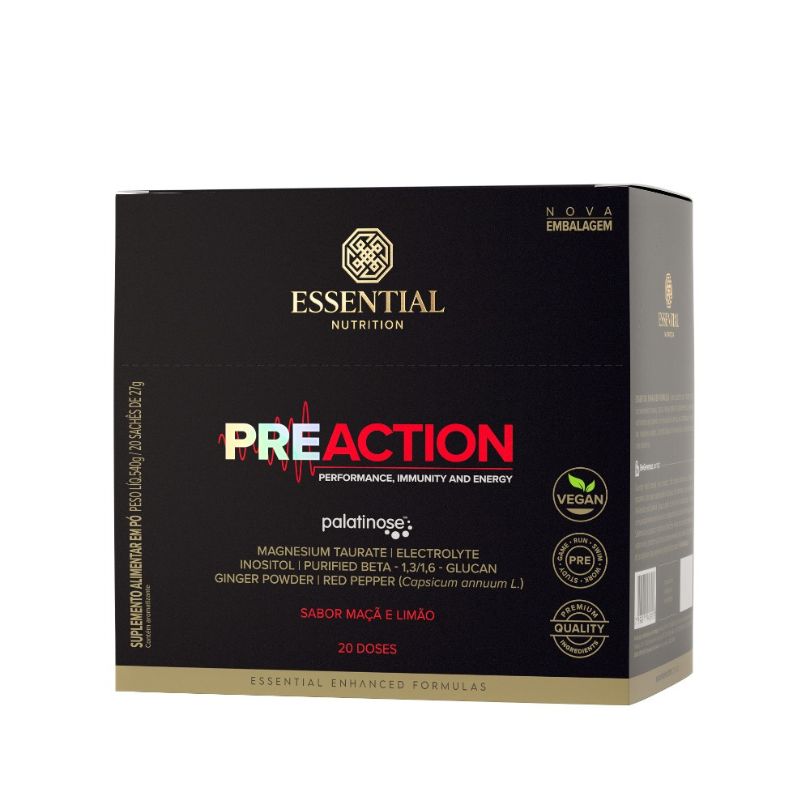 <p dir="ltr">O <strong>Pre Action sabor maçã e limão Essential Nutrition</strong>, é um suplemento vegano que une componentes de liberação prolongada e elevado potencial energético. Traz também vitaminas do complexo B, minerais, B-glucana de levedura, extrato aromático de chá verde, gengibre, pimenta e eletrólitos.</p> <h2 dir="ltr">Sobre o ingrediente:</h2> <p dir="ltr"><strong>Palatinose®: </strong>carboidrato obtido a partir da beterraba que possui baixo índice glicêmico, sendo fonte de energia constante e prolongada para o organismo.</p> <p dir="ltr"><strong>Magnésio taurato: </strong>magnésio aliado ao aminoácido taurina, que possui alta biodisponibilidade e atua em mais de 300 reações no organismo. </p> <p dir="ltr"><strong>Vitaminas complexo B: </strong>importantes para o metabolismo energético e no sistema imunológico.</p> <h2 dir="ltr">Sugestão de consumo:</h2> <p dir="ltr">Adicione um sachê (27g) em aproximadamente 350ml (1 copo grande) de água gelada e misture até a total homogeneização. Beba imediatamente após o preparo.</p> <h2 dir="ltr">Motivos para escolher o produto:</h2> <ul> <li dir="ltr"> <p dir="ltr">Sem adição de açúcar;</p> </li> <li dir="ltr"> <p dir="ltr">Com vitaminas do complexo B;</p> </li> <li dir="ltr"> <p dir="ltr">Vegano;</p> </li> <li dir="ltr"> <p dir="ltr">Sem corantes e aromas artificiais;</p> </li> <li dir="ltr"> <p dir="ltr">Com adoçante natural;</p> </li> <li dir="ltr"> <p dir="ltr">Sem glúten;</p> </li> <li dir="ltr"> <p dir="ltr">Sem lactose.</p> </li> </ul> <h2 dir="ltr">Sobre a marca:</h2> <p dir="ltr">A Essential Nutrition é uma marca especializada em nutrição funcional, produzindo produtos de extrema qualidade, utilizando as melhores matérias-primas e em suas concentrações ideias, excluindo o uso de ingredientes geneticamente modificados, glúten, lactose, corantes, conservantes e adoçantes artificiais.</p>