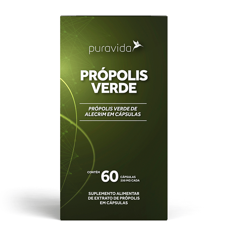 A Própolis Verde, da Pura Vida, é um extrato aquoso com concentração de 30% de própolis verde na dosagem, colhido por abelhas silvestres. Essa versão em cápsulas, anula o possível sabor desagradável e oferece praticidade e precisão.<br>Sobre os ingredientes: <br>Própolis Verde: é uma variedade da Própolis, que é uma resina coletada por abelhas na vegetação e utilizada na colmeia para protegê-la contra vírus, bactérias e fungos. A Própolis Verde, se diferencia por ter em sua composição, a presença dos fenólicos artepelina C e bacarina.<br>Recomendação de consumo:<br>Consuma 2 cápsulas ao dia ou de acordo com a orientação de um médico ou nutricionista. <br>Por que escolher esse produto?<br>Sem ingredientes artificiais<br>Sem glúten<br>2,4g de compostos fenólicos na porção<br>Sobre a marca: <br>A Pura Vida é uma empresa com o propósito de promover uma alimentação sem comidas artificiais, pobres em nutrientes, ricas em conservantes, pesticidas, gorduras hidrogenadas ou com açúcar em excesso. Preocupa-se, com o impacto da alimentação na qualidade de vida e no meio ambiente, utilizando produtos frescos e de produção recente obtidos de cultivadores confiáveis e além de utilizar tecnologias para preservar, realçar e concentrar as propriedades dos alimentos.