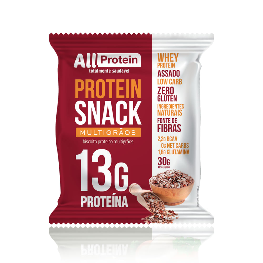 <p dir="ltr">O <strong>Protein Snack Multigrãos da All Protein</strong> combina crocância e o sabor marcante dessa dupla clássica. Cada pacote contém 13g de proteína em sua composição, sendo uma opção saborosa para quem busca por snacks proteicos.</p>_x000D_ <h2 dir="ltr">Sugestão de consumo:</h2>_x000D_ <p dir="ltr">Perfeito para os lanches da manhã ou da tarde, vem em embalagem individual prática, fácil de levar para o trabalho, faculdade ou escola.</p>_x000D_ <h2 dir="ltr">Motivos para escolher o produto:</h2>_x000D_ <ul>_x000D_ <li dir="ltr" aria-level="1">_x000D_ <p dir="ltr" role="presentation">Isento de glúten;</p>_x000D_ </li>_x000D_ <li dir="ltr" aria-level="1">_x000D_ <p dir="ltr" role="presentation">13 g de proteína por porção;</p>_x000D_ </li>_x000D_ <li dir="ltr" aria-level="1">_x000D_ <p dir="ltr" role="presentation">Assado;</p>_x000D_ </li>_x000D_ <li dir="ltr" aria-level="1">_x000D_ <p dir="ltr" role="presentation">Elaborado com blend proteico: whey protein e proteína isolada da soja;</p>_x000D_ </li>_x000D_ <li dir="ltr" aria-level="1">_x000D_ <p dir="ltr" role="presentation">Low carb - Baixo teor de carboidratos;</p>_x000D_ </li>_x000D_ <li dir="ltr" aria-level="1">_x000D_ <p dir="ltr" role="presentation">Fonte de fibras.</p>_x000D_ </li>_x000D_ </ul>_x000D_ <h2 dir="ltr">A Marca</h2>_x000D_ <p dir="ltr">Fundada em 2014 em Porto Alegre (RS), a <strong>All Protein</strong> nasceu com o propósito de oferecer suplementos e alimentos que unem qualidade, praticidade e sabor. A marca se diferencia pelo uso de ingredientes selecionados, fórmulas que valorizam a inovação nutricional e opções que atendem a diferentes estilos de vida. Com um portfólio versátil e em constante evolução, a All Protein se consolida como referência em produtos que combinam funcionalidade e experiência de sabor.</p>