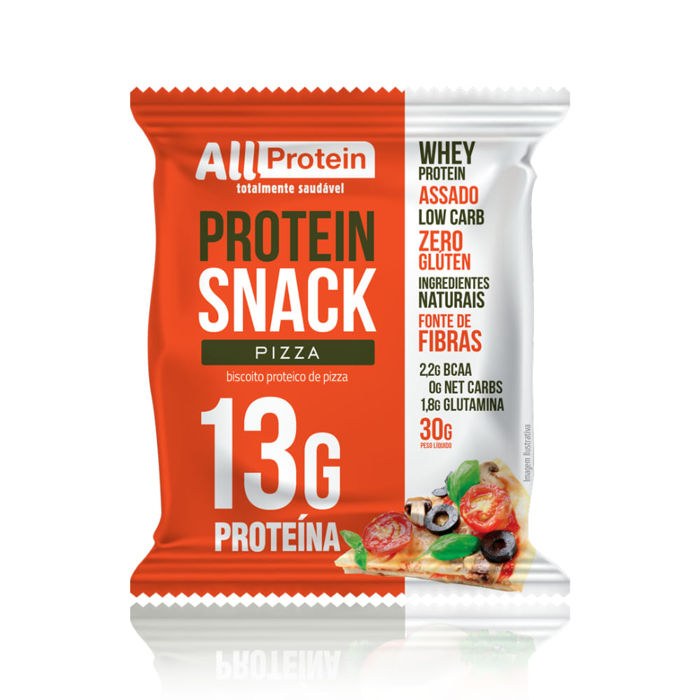 <p dir="ltr">O <strong>Protein Snack da All Protein </strong>combina crocância e o sabor clássico de Pizza. Cada pacote contém 13g de proteína em sua composição, sendo uma opção saborosa para quem busca por snacks proteicos.</p>_x000D_ <h2 dir="ltr">Sugestão de consumo:</h2>_x000D_ <p dir="ltr">Perfeito para os lanches da manhã ou da tarde, vem em embalagem individual prática, fácil de levar para o trabalho, faculdade ou escola.</p>_x000D_ <h2 dir="ltr">Motivos para escolher o produto:</h2>_x000D_ <ul>_x000D_ <li dir="ltr" aria-level="1">_x000D_ <p dir="ltr" role="presentation">Isento de glúten;</p>_x000D_ </li>_x000D_ <li dir="ltr" aria-level="1">_x000D_ <p dir="ltr" role="presentation">13 g de proteína por porção;</p>_x000D_ </li>_x000D_ <li dir="ltr" aria-level="1">_x000D_ <p dir="ltr" role="presentation">Assado;</p>_x000D_ </li>_x000D_ <li dir="ltr" aria-level="1">_x000D_ <p dir="ltr" role="presentation">Elaborado com blend proteico: whey protein e proteína isolada da soja;</p>_x000D_ </li>_x000D_ <li dir="ltr" aria-level="1">_x000D_ <p dir="ltr" role="presentation">Low carb - Baixo teor de carboidratos;</p>_x000D_ </li>_x000D_ <li dir="ltr" aria-level="1">_x000D_ <p dir="ltr" role="presentation">Fonte de fibras.</p>_x000D_ </li>_x000D_ </ul>_x000D_ <h2 dir="ltr">A Marca</h2>_x000D_ <p dir="ltr">Fundada em 2014 em Porto Alegre (RS), a <strong>All Protein</strong> nasceu com o propósito de oferecer suplementos e alimentos que unem qualidade, praticidade e sabor. A marca se diferencia pelo uso de ingredientes selecionados, fórmulas que valorizam a inovação nutricional e opções que atendem a diferentes estilos de vida. Com um portfólio versátil e em constante evolução, a All Protein se consolida como referência em produtos que combinam funcionalidade e experiência de sabor.</p>