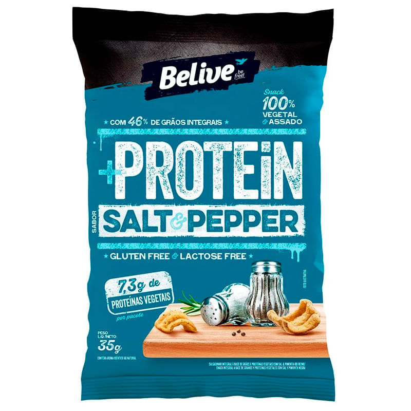 Informações técnicas do produto:<br> O Protein snack salt e pepper, da Belive, 35g, é um salgadinho integral feito com grãos e proteínas vegetais, com um toque de sal e pimenta-do-reino, para adicionar mais proteínas na dieta com praticidade e muito mais sabor.<br> <br> Cada pacote fornece 7,3 g de proteína vegetal, sem ingredientes de origem animal, livre de glúten ou lactose.<br> <br> Recomendação de consumo:<br> O Protein snack salt e pepper pode ser consumido a qualquer hora do dia como uma deliciosa opção de lanche na faculdade, trabalho, academia, onde quiser.<br> <br> Alergênicos:<br> Contém derivados de soja.<br> <br> Motivos para escolher esse produto?<br> 46% de grãos integrais<br> Milho não transgênico<br> 100% vegetal<br> Assado<br> Não contém glúten<br> Sem lactose ou leite<br> Proteínas vegetais da soja e ervilha<br> 7,3 g proteína no pacote<br> Com arroz, chia e quinoa<br> Informações sobre a marca:<br> A Belive é uma marca que acredita que para ser livre, é preciso ter escolhas saudáveis e saborosas. E dar espaço para a alegria da liberdade de comprar o que você realmente gosta. E comprar o produto sem medo e comer sem culpa. A empresa tem uma linha de produtos inteiramente livre de glúten, sem lactose e sem ovos.