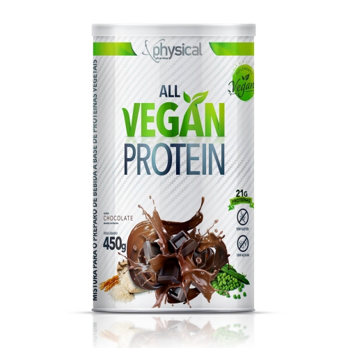 Proteína Vegana Physical Pharma All Vegan Protein Chocolate 450gO All Vegan Protein Alinha o bem estar ao máximo do seu rendimento físico. São 21g de proteína orgânica e limpa que fornece um complexo perfil de aminoácidos essenciais que auxiliam a reduzir o tempo de recuperação após o exercício e o ganho de massa muscular.O sabor importa sim! A combinação das proteínas de ervilha e do arroz proporcionam uma cremosidade única. Não contém adição de açúcares.Você encontra no encontra no tamanho 450g e nos sabores:•Baunilha Toffee•ChocolateModo de preparo:Dissolver 35g (2 medidas) do produto em 200mL (1 copo) de água ou bebida de sua preferência e consumir logo após o preparo.Conservar este produto fechado, ao abrigo da luz, calo e umidade, depois de aberto, consumir preferencialmente em 30 dias.Sugestão de uso:Consumir uma vez ao dia ou conforme a orientação profissional.Conservar este produto fechado ao abrigo da luz, calor e umidade. Depois de aberto, consumir preferencialmente em 30 Dias.Compre agora a Proteína Vegana Physical Pharma All Vegan Protein Chocolate 450ge garanta uma entrega rápida e segura!