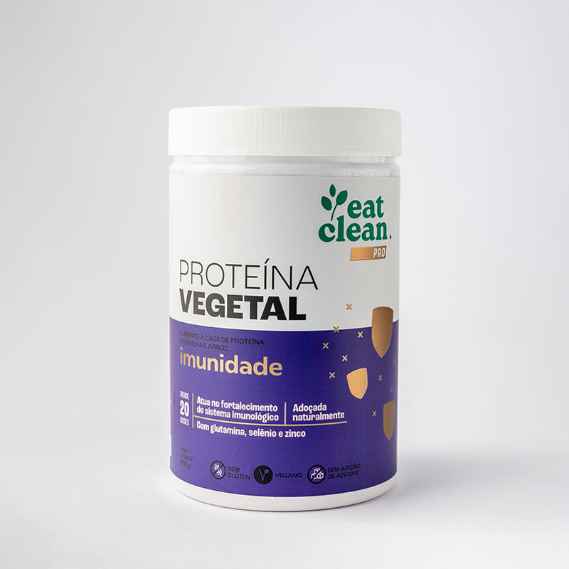 <h2><strong>Proteína Vegetal Imunidade Eat Clean 600g</strong></h2> <p><strong>Proteína Vegetal Imunidade</strong>, da marca <strong>Eat Clean</strong>, é um suplemento proteico, sabor baunilha cítrica, composto de proteína de ervilha e proteína do arroz que combinadas oferecem um completo perfil de aminoácidos e também é enriquecida com todas as vitaminas do Complexo B, incluindo a Vitamina B12. Além de complementar o aporte proteico diário de forma fácil, prática, contém uma combinação de glutamina, selênio e zinco, nutrientes que auxiliam na modulação do sistema imunológico. Pode ser consumida batida tanto complementando uma refeição principal, como o café da manhã, quanto em refeições intermediárias, como lanches, pré e pós-treino, e ceia. </p> <p> </p> <h2><strong>Sugestão de consumo: </strong></h2> <p>Adicionar 30g (2 medidores) em água gelada ou bebida de sua preferência até dissolver completamente.</p> <h2><strong> Motivos para escolher o produto: </strong></h2> <ul> <li style="list-style-type: disc;">Não contém glúten</li> <li>Fornece 24g de proteína na porção</li> <li style="list-style-type: disc;">Vegano</li> <li style="list-style-type: disc;">Sem açúcar</li> </ul> <h2><strong>Sobre a marca:</strong></h2> <p>A <strong>Eat Clean</strong> começou apenas com uma loja no ramo alimentício, mas atualmente ela se expandiu e se tornou uma das marcas mais reconhecidas, por possuir o objetivo de produzir e vender produtos naturais, saudáveis, sem rótulos enganadores. Que possuam muito amor, com gosto de comida caseira e saborosa, contribuindo para a saœde das pessoas, além de sempre respeitarem a natureza.</p>