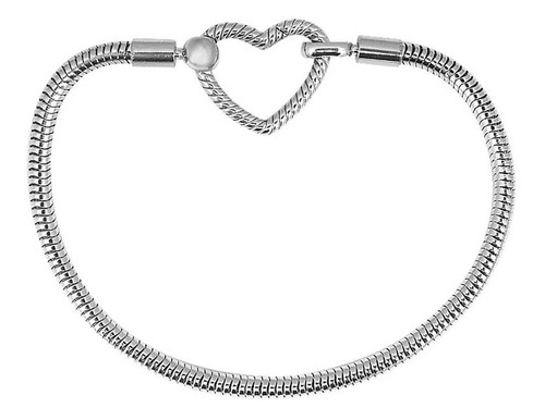 Tipo de produto: Pulseira para berloques <br /> <br /> Caracteristicas especiais: pulseira com espessura de 3mm, fecho coração gancho<br /> <br /> Material: aço inoxidável<br /> <br /> (Não acompanha berloques)<br /> <br /> <br /> <br /> *** Peças em aço inox:<br /> <br /> Você pode entrar no mar, na piscina, no banho com suas joias sem se preocupar, o aço inox é um metal resistente, não escurece e nem enferruja em contato com a água salgada;<br /> Não fica preta e nem descasca porque não oxida, para dar brilho basta passar uma flanela mágica que está resolvido;<br /> Se você é alérgico o mais recomendado é usar o aço inox para não causar alergias. Lembrando que pode haver pessoas com alergia a esse aço, não está descartada a possibilidade.<br /> <br /> <br /> Como saber o tamanho da pulseira:<br /> Meça seu pulso justo sem folga e adicione 2 cm para caber os berloques<br /> Exemplo : se o seu pulso justo medir 16 cm , a pulseira<br /> recomendada para você é a 18 e assim por diante