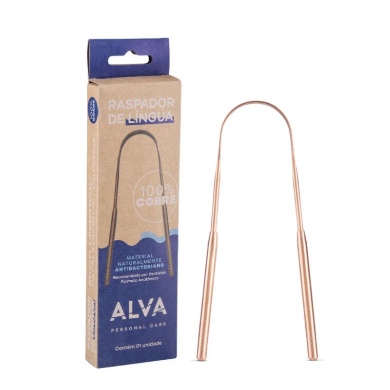 <p>O <strong>raspador de língua</strong> da Alva Personal Care é feito <strong>100% de cobre</strong>, material que é naturalmente antibacteriano. </p> <p>Seu uso é indicado pela manhã antes da ingestão de água ou alimentos para limpar a língua e eliminar os resíduos da saburra lingual, processo natural que ocorre enquanto nós dormimos, pois a produção de saliva diminui e isso favorece o acúmulo de bactérias, células mortas e restos de alimentos</p> <p> </p> <h2>Motivos para escolher o produto:</h2> <ul> <li>Limpeza eficiente</li> <li>Melhora do hálito</li> <li>Prevenção de cáries</li> <li>Elimina o aspecto esbranquiçado na língua</li> </ul> <h2>Sobre a Marca:</h2> <p>A Alva nasceu de um movimento pela busca de uma vida baseada em <strong>escolhas saudáveis. </strong>Mais do que uma marca é um movimento que transforma a rotina do dia a dia em cuidado com a saúde. Viver Alva é adotar um estilo de vida saudável, divertido e comprometido com o planeta.</p>